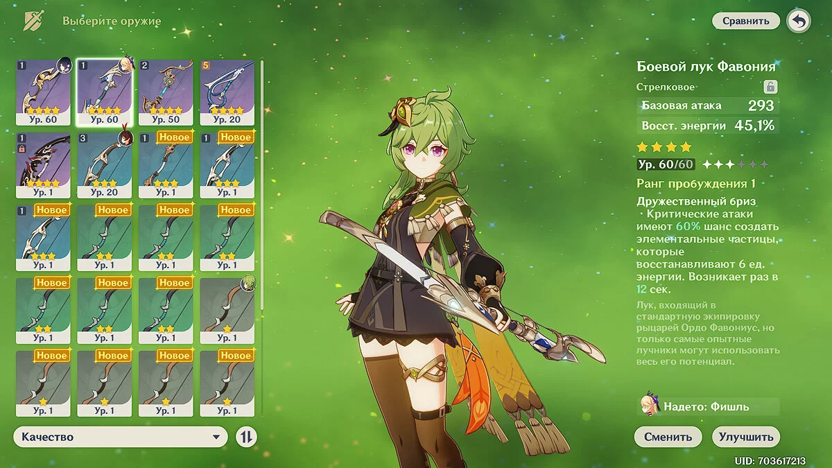 Боевой лук Фавония — четырехзвездочный лук, который пассивно генерирует частицы энергии для всего отряда и повышает восстановление энергии героя. Для срабатывания пассивного эффекта требуется критический шанс от 50% и выше.