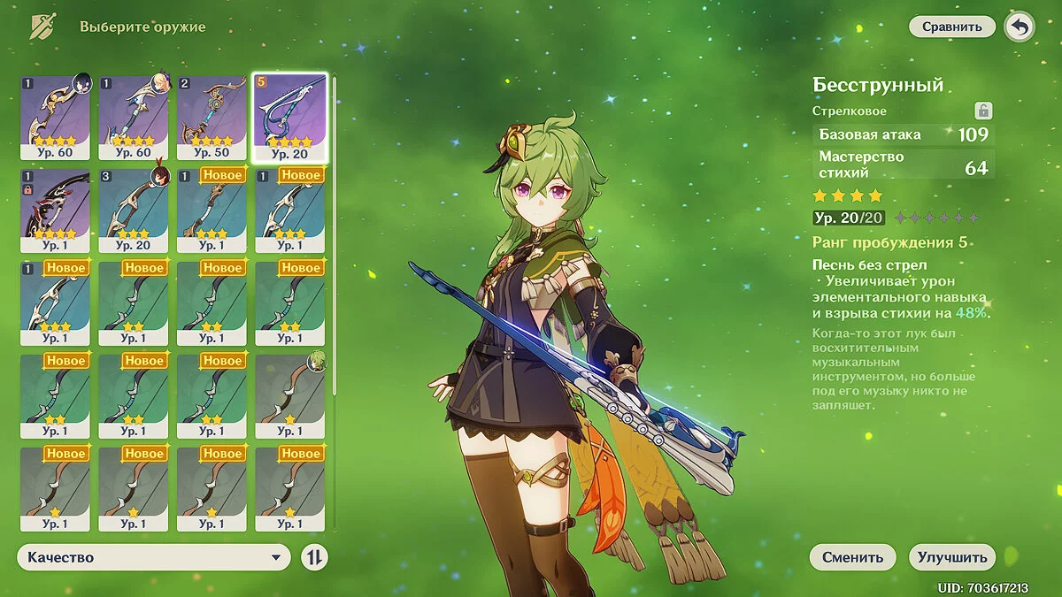 Бесструнный — простой четырехзвездочный лук, увеличивающий мастерство стихий и повышающий урон от способностей. Урон элементальных навыков и взрыва стихий повышается от 24% до 48%.