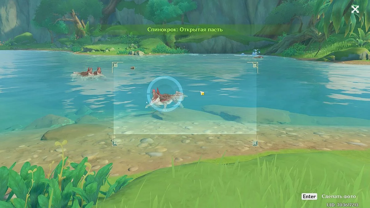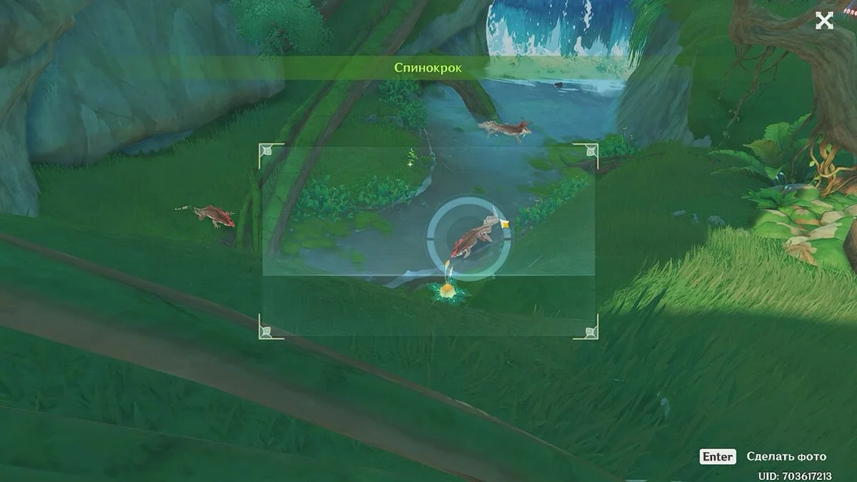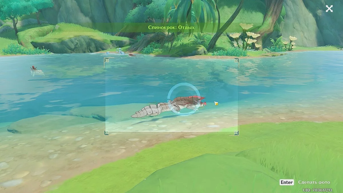 Телепортируйтесь к маркеру на карте и отыщите спинокроков. Сперва сфотографируйте атаку животного. Чтобы сделать это, подойдите к животному поближе, чтобы он попытался ударить его.