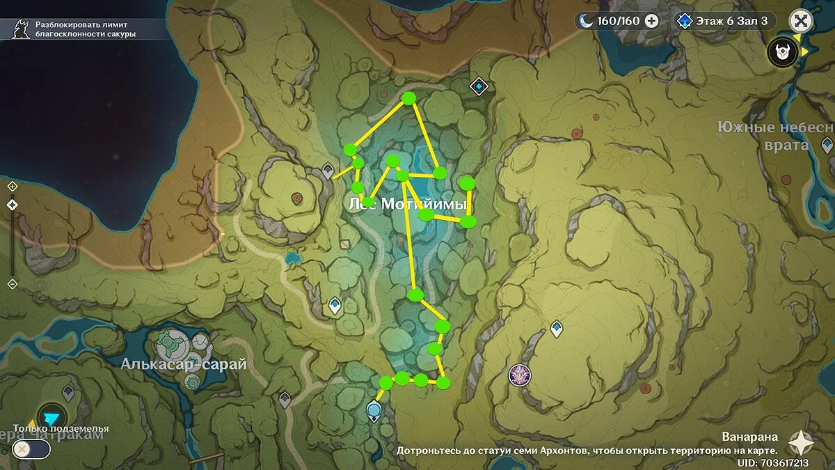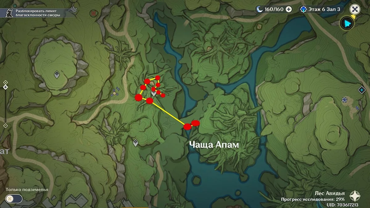 На карте указано девять мест, где могут появляться грибы руккхашава в Чаще Апам.