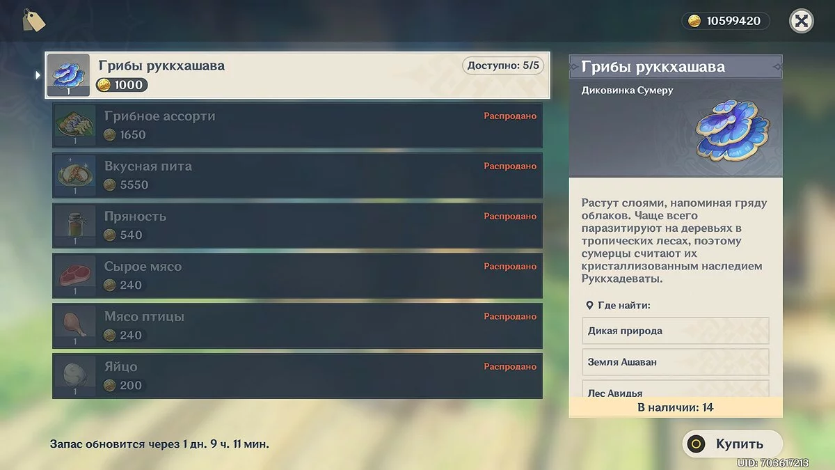 Он продаёт грибы по 1000 моры за штуку. Ассортимент товаров обновляется раз в двое суток. Помимо грибов, вы также можете приобрести у него товары, указанные на скриншоте ниже.