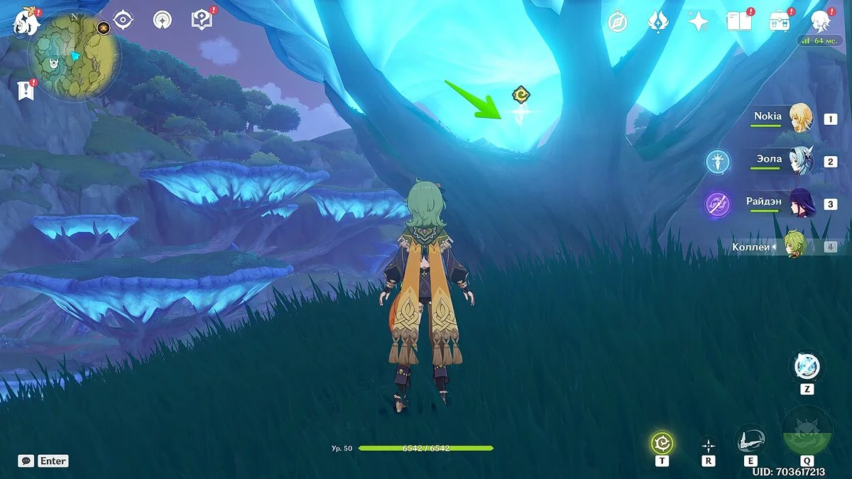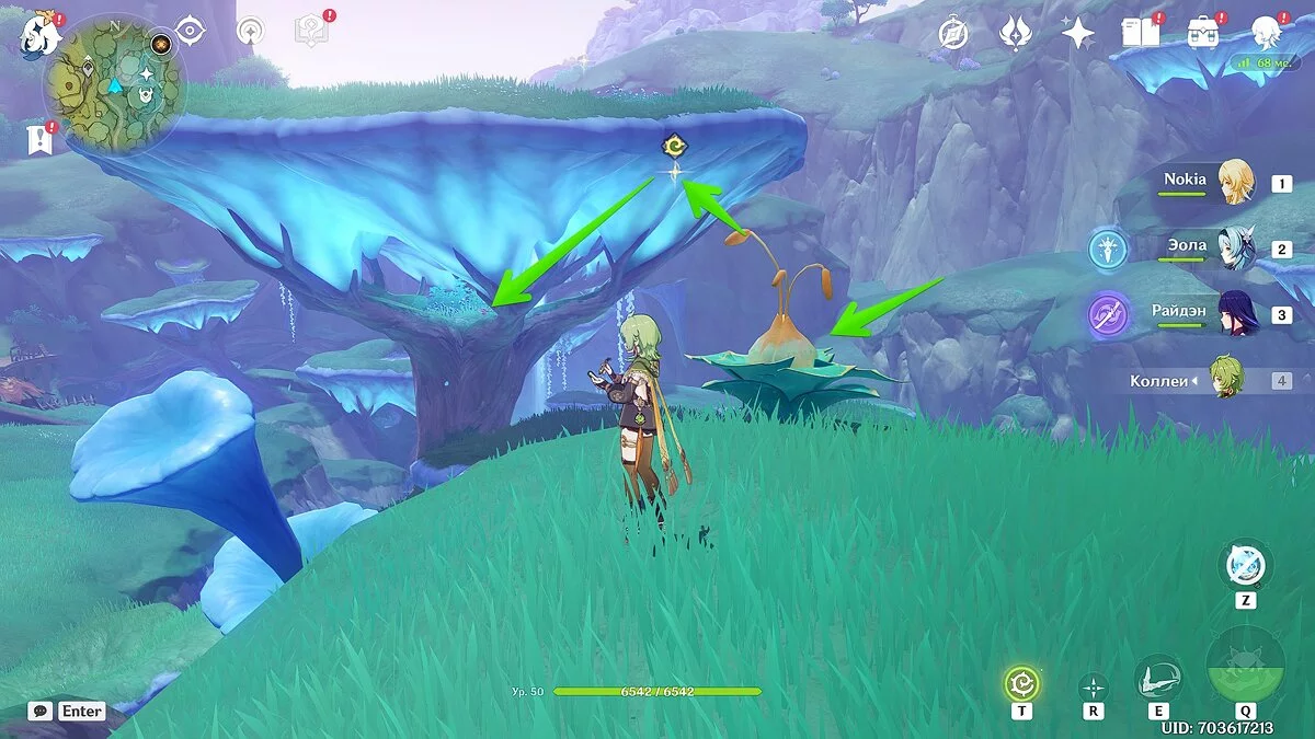 От места, где вы обнаружили тринадцатый гриб, пройдите немного влево и найдите бутон. Выстрелите по нему персонажем стихии Дендро, чтобы активировать четырёхлистный знак. Гриб растёт в огромном цветке, куда можно забраться при помощи знака из бутона.