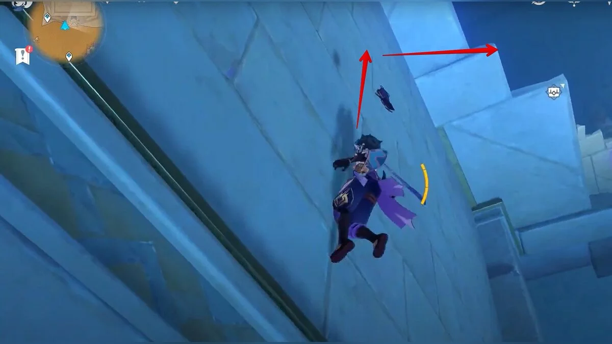 Подойдите к стене слева и поставьте Гео-конструкцию. Её может создать Чжун Ли, Нингуан и Путешественник (Гео). Забирайтесь на неё, прыгайте и взлетайте выше, чтобы забраться на уступ. Там находится сундук, который засыпан песком. Используйте умение Анемо-героя.