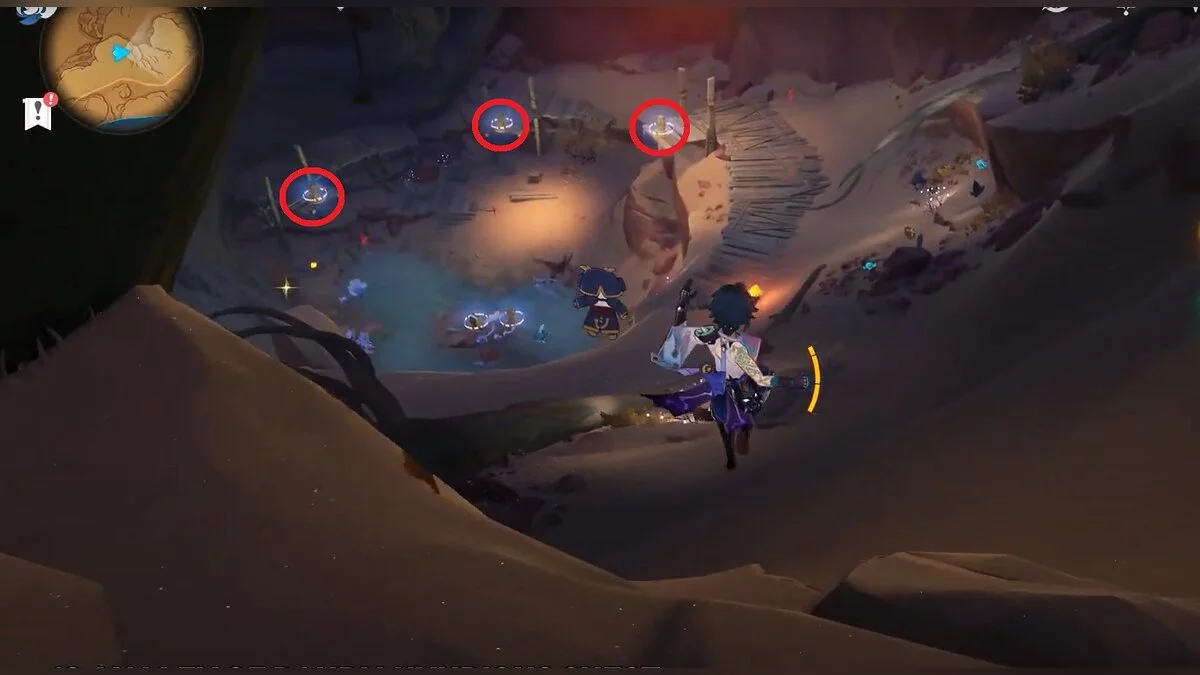 Двигайтесь на север, пока не увидите пять холмиков из песка. Подойдите к ним и примените любое умение Анемо-персонажа. Таким образом вы сможете получить доступ к сундуку.