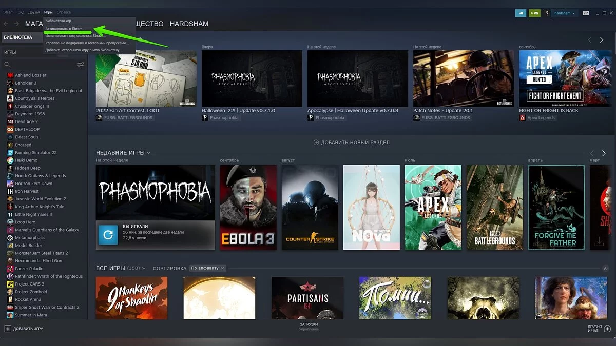 В верхнем меню слева найдите раздел «Игры». Наведите на него курсор мыши, затем выберите «Активировать в Steam…».