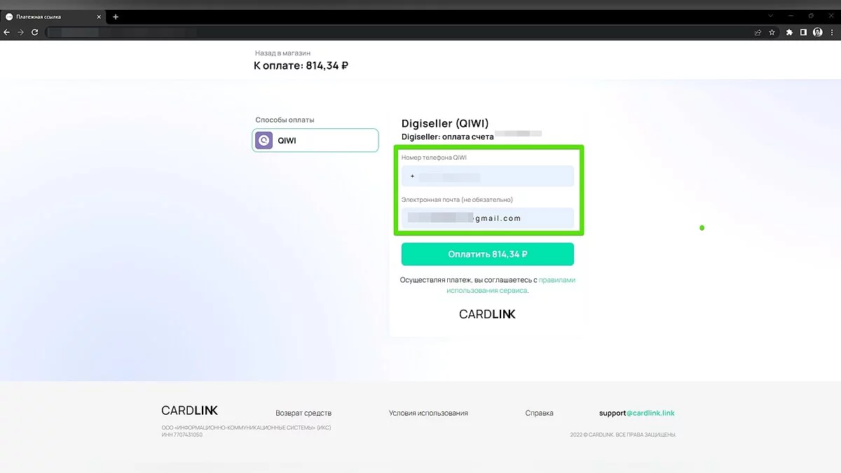 Откроется дополнительное окно, где нужно указать номер телефона кошелька QIWI и адрес электронной почты. Последний понадобится для получения квитанции. Рекомендуем обязательно сохранить её.