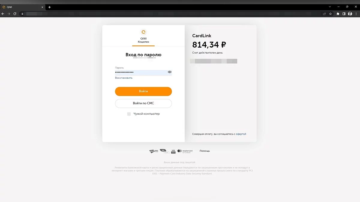 Нажимая кнопку «Оплатить», нас перенаправит к вводу пароля от кошелька. Заполняем единственную графу и щелкаем «Войти». После этого подтверждаем оплату и вводим пароль из SMS, который отправлен на привязанный к кошельку номер телефона.
