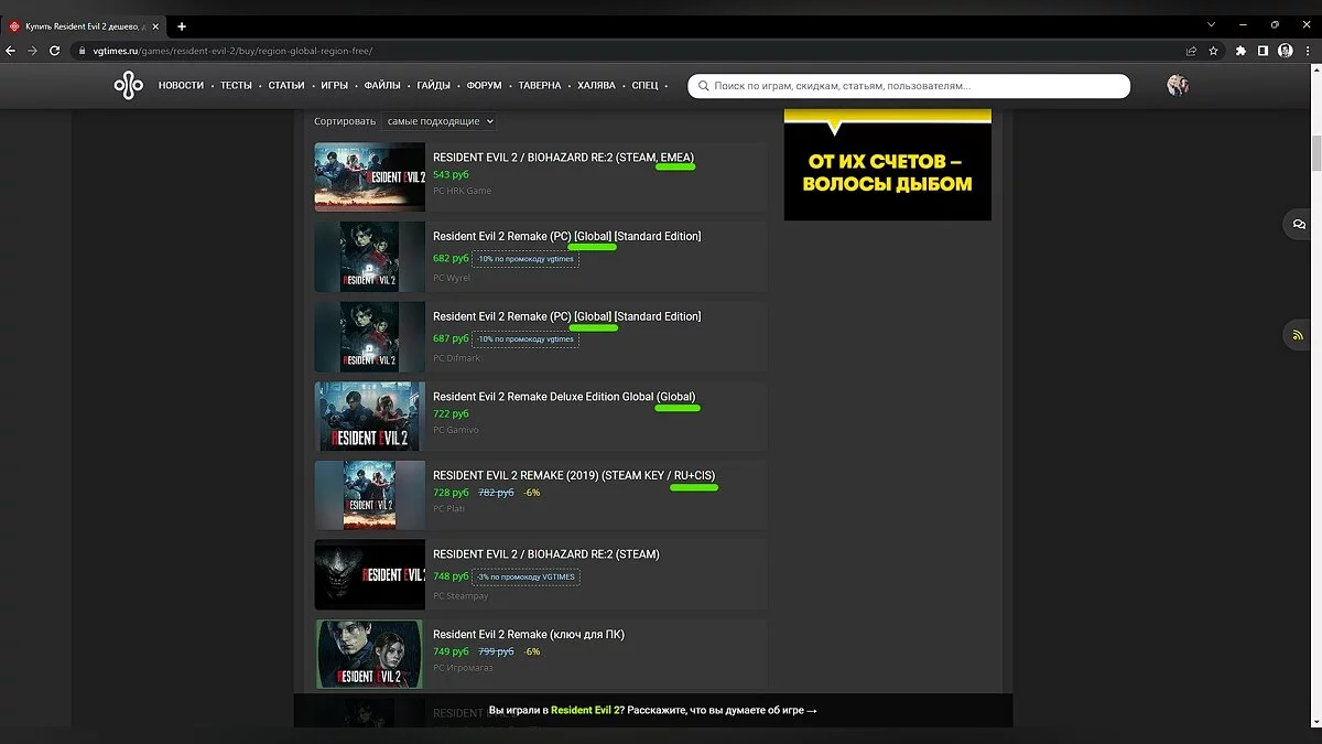 Наверняка с выбором игры у вас не возникнет трудностей. Каждый геймер знает, на прохождение какой игры хотел бы потратить свободное время. Например, в данный момент я был бы не прочь перепройти шикарную вторую часть «Обителя зла» от Capcom. Но проблема в том, что данной игры нет на моём личном аккаунте в Steam. Конечно, определившись с игрой, многие сразу идут на сайт известного им магазина и смотрят цены там, но это не гарантирует вам, что вы найдете игру по лучшей цене. Именно поэтому лучше воспользоваться агрегатором цен на игры на VGTimes.