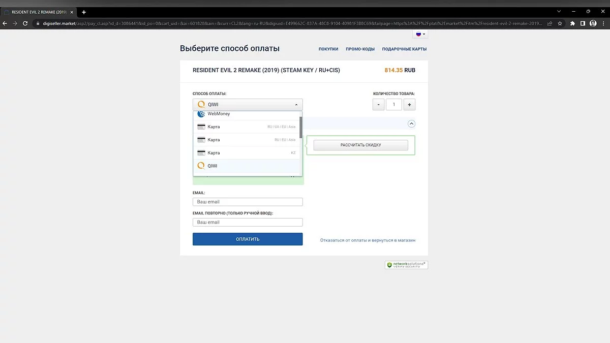 На моём QIWI-кошельке завалялось несколько тысяч рублей. Выбираю этот способ для приобретения товара, заполняю строку «EMAIL» и нажимаю «Оплатить». ВАЖНО: указывать нужно ваш личный настоящий e-mail, к которому у вас есть доступ.
