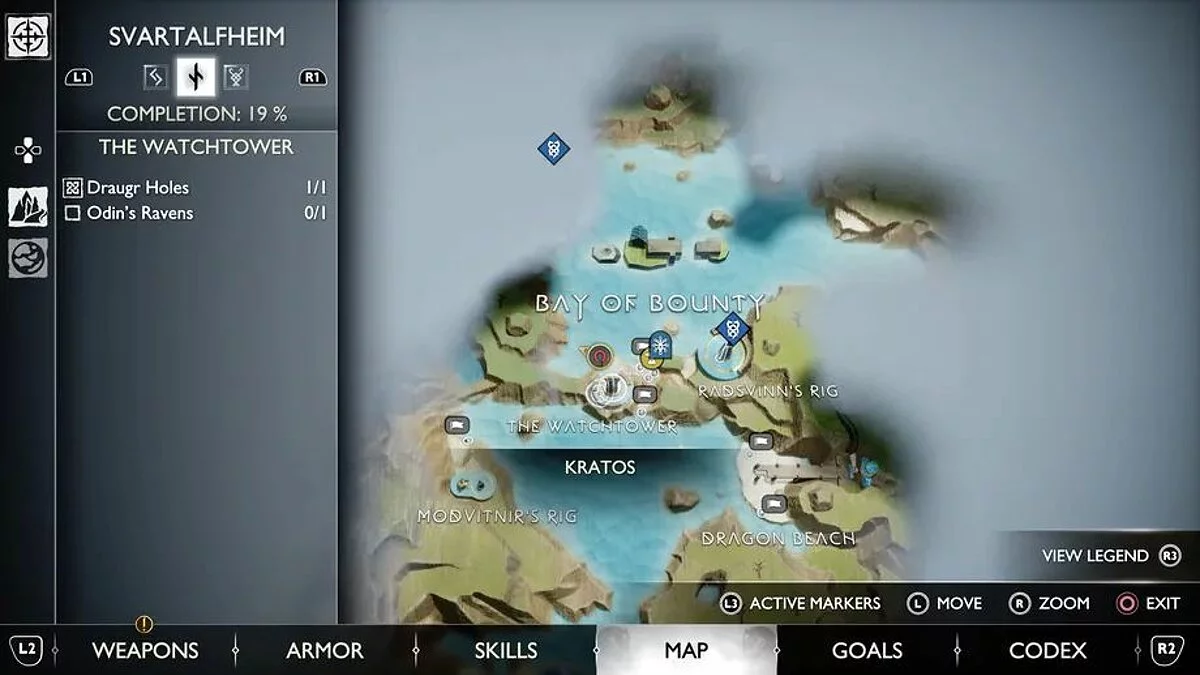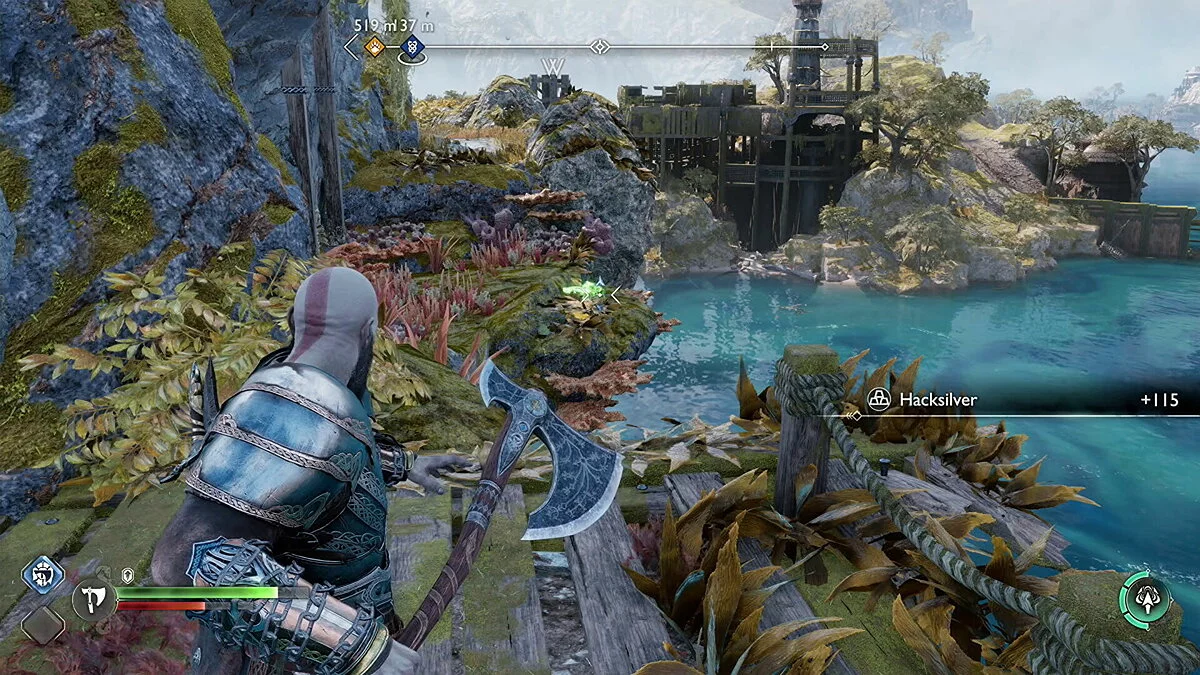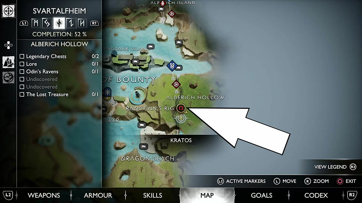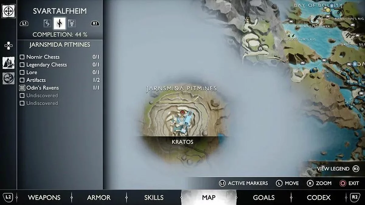 Попасть в область с этим вороном вы сможете только после того, как приобретете оружие в Кузнице в Свартальвхейме с Броком в рамках сюжетной истории. Используйте его слева от сундука на острове, чтобы подняться наверх.