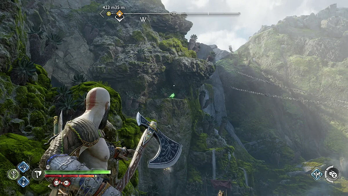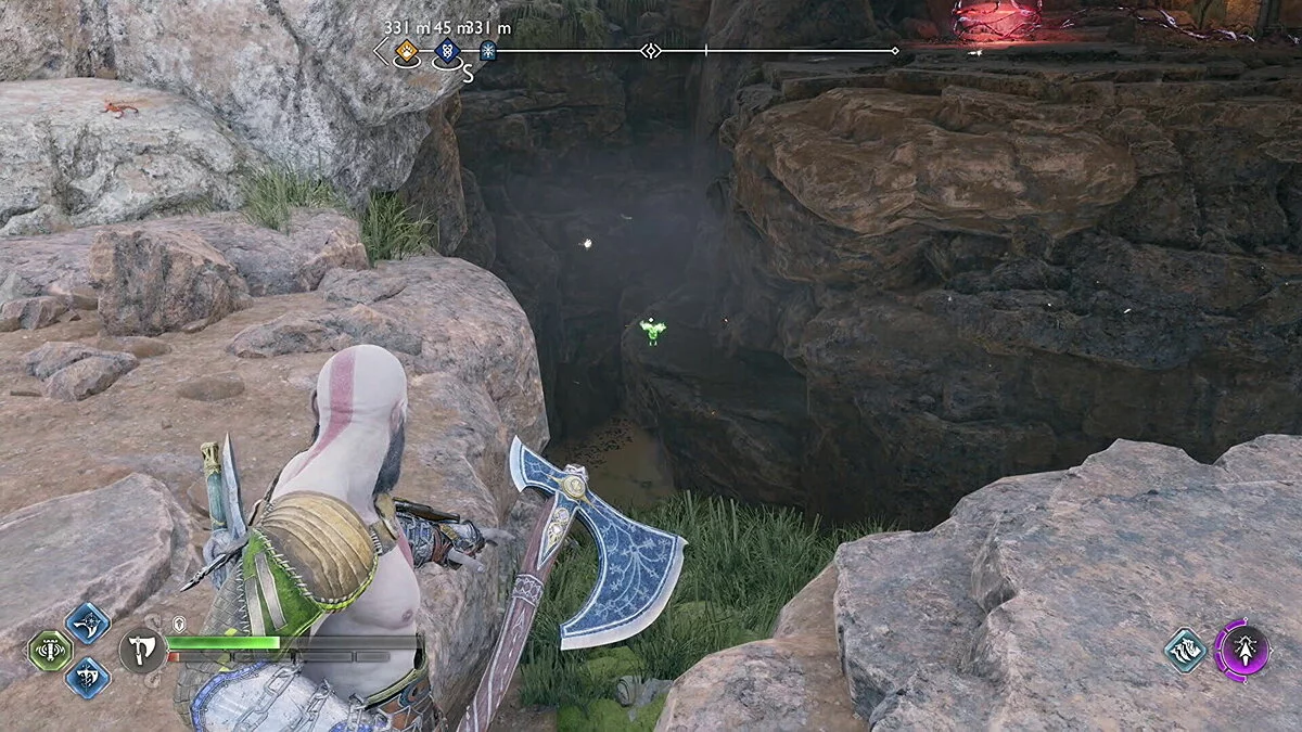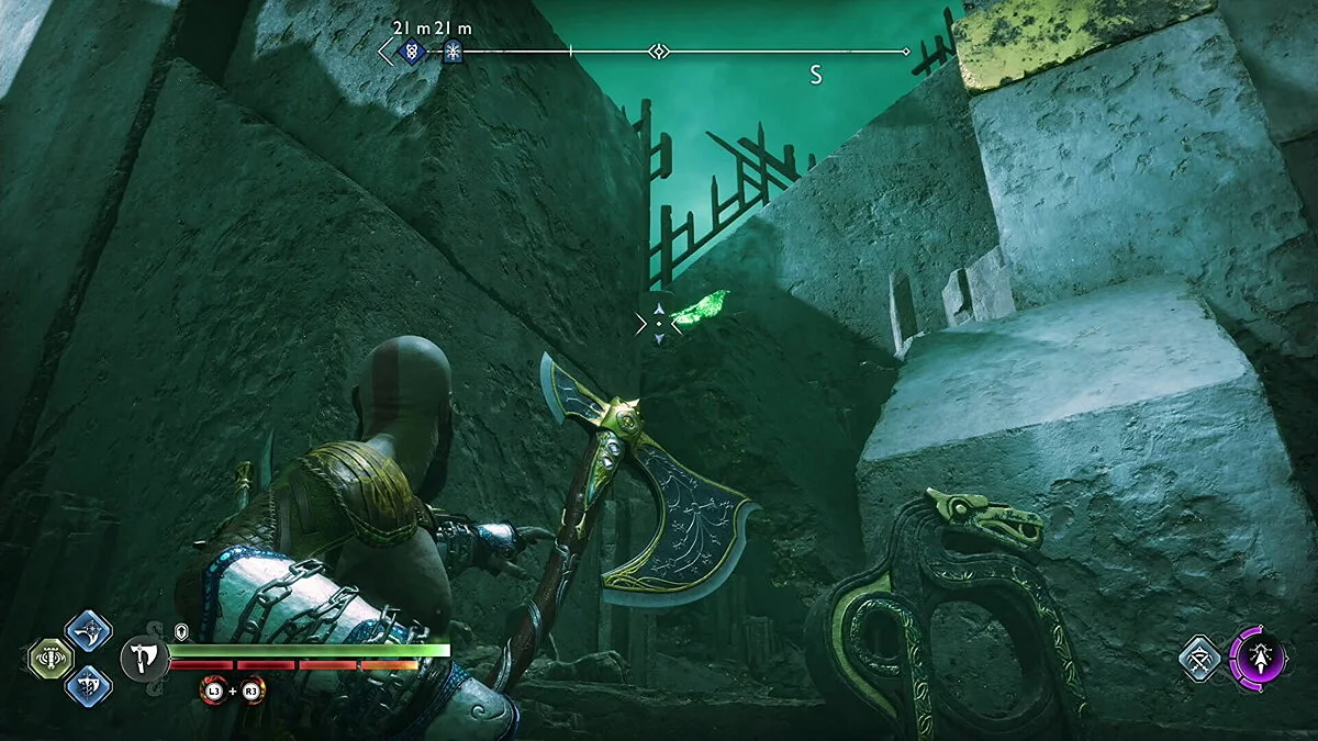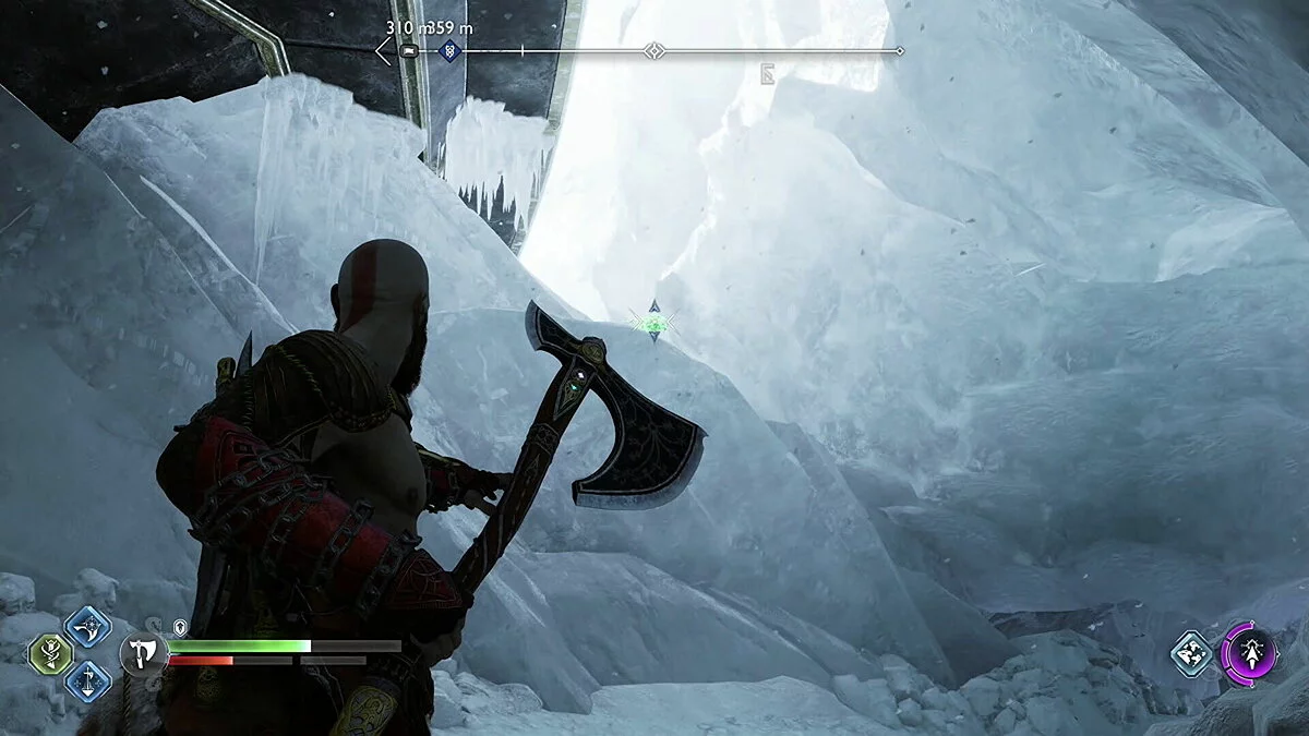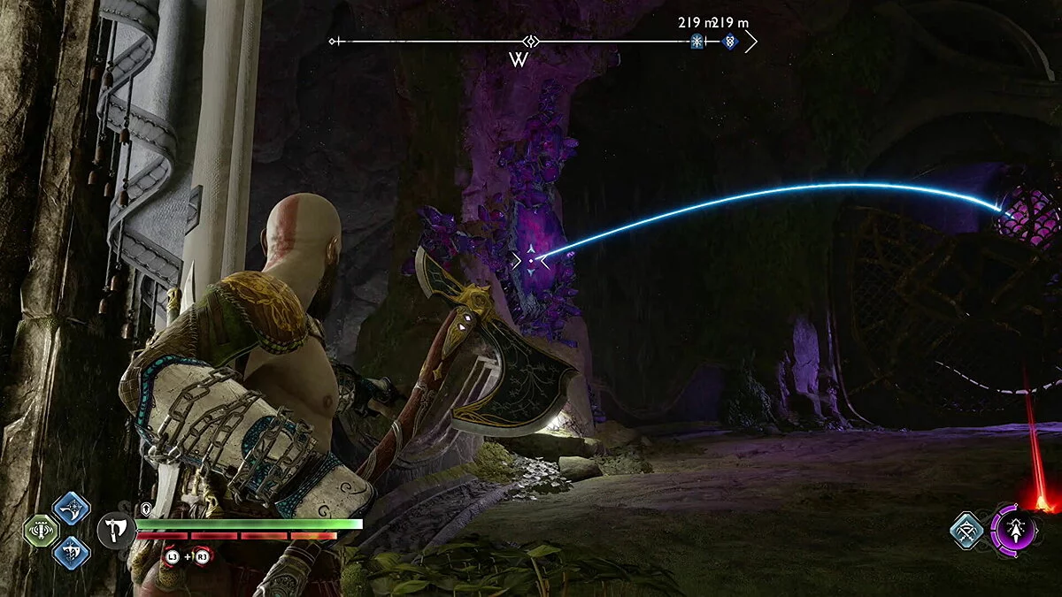 Цельтесь в нижнюю левую часть кристалла и встаньте Кратосом так, чтобы линия стала синей. Как только вы окажетесь на позиции, бросьте свой топор.