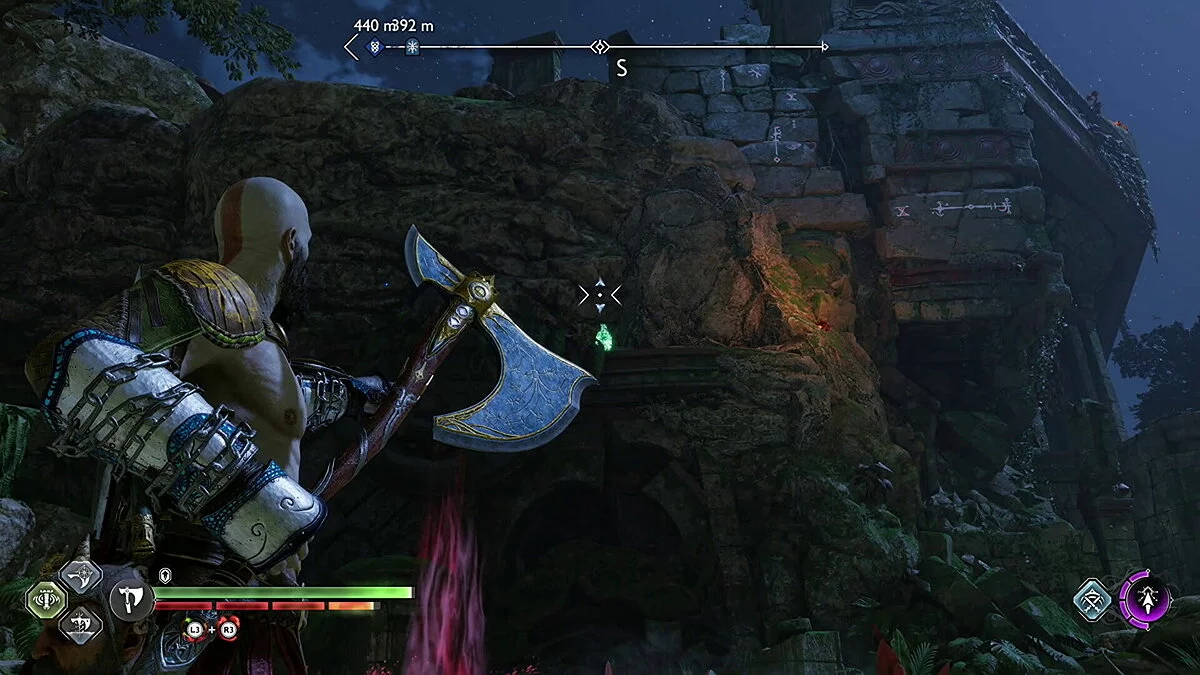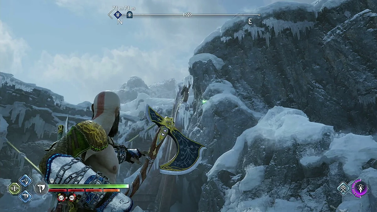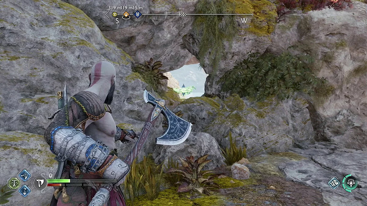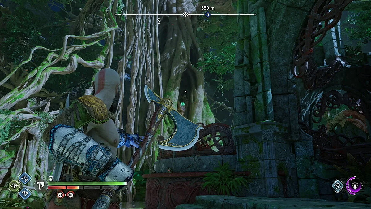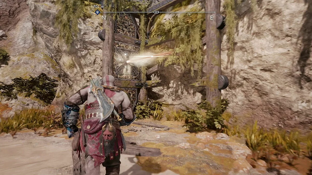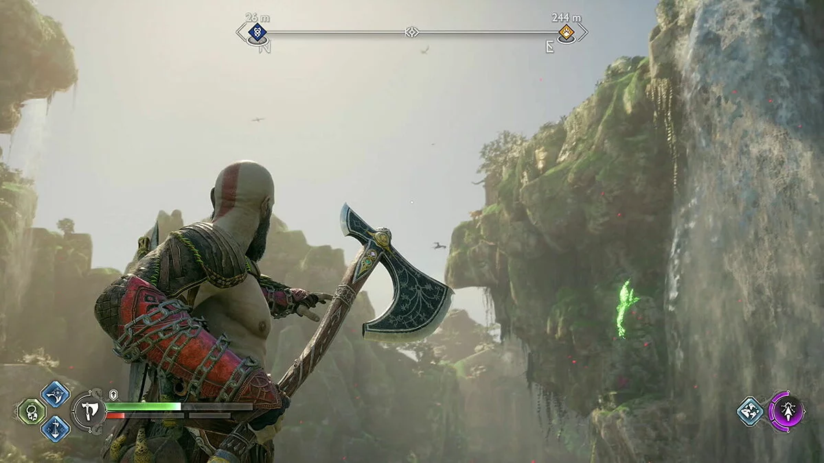 Цельтесь в нижнюю левую часть кристалла и встаньте Кратосом так, чтобы линия стала синей. Как только вы окажетесь на позиции, бросьте свой топор.