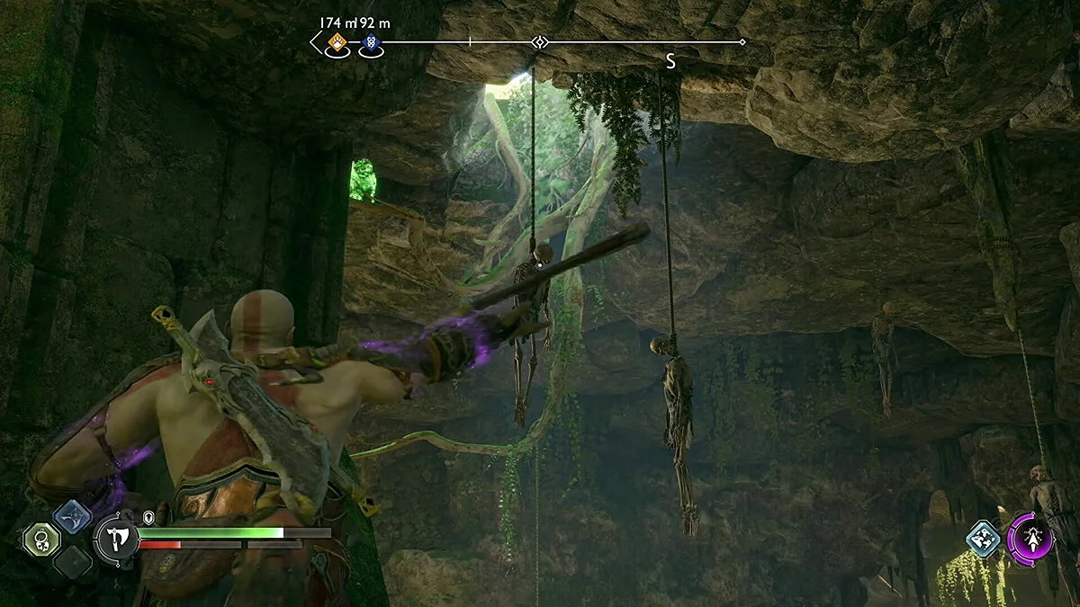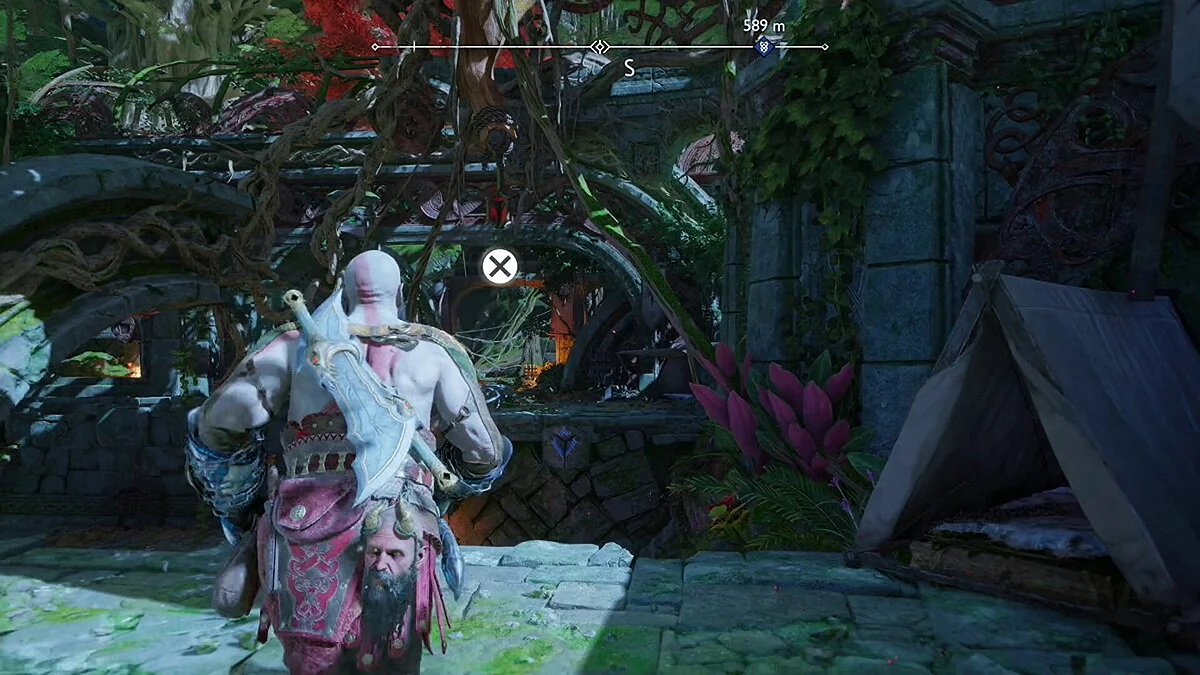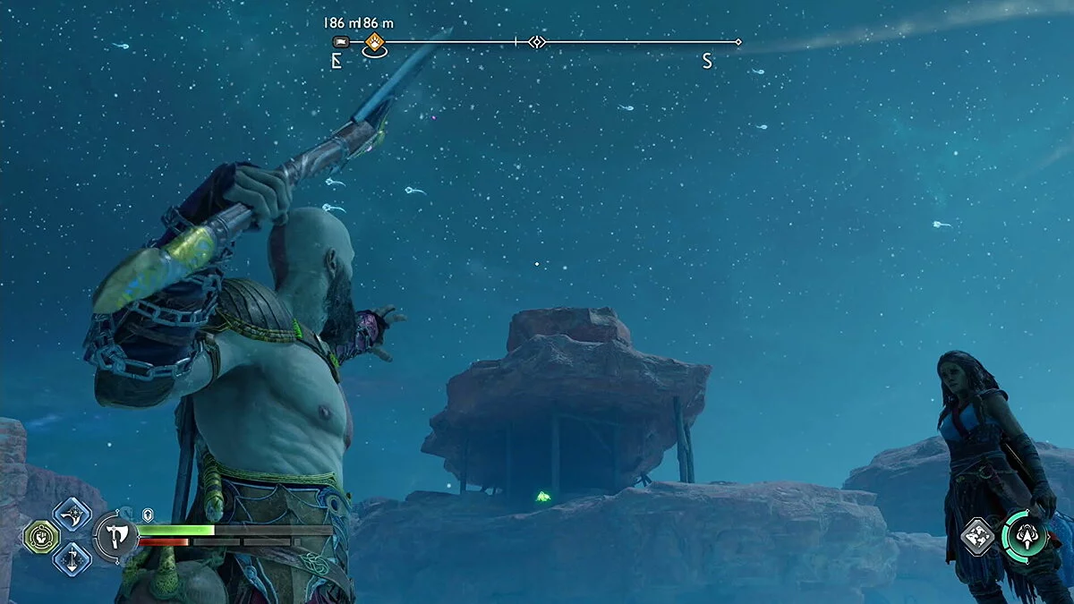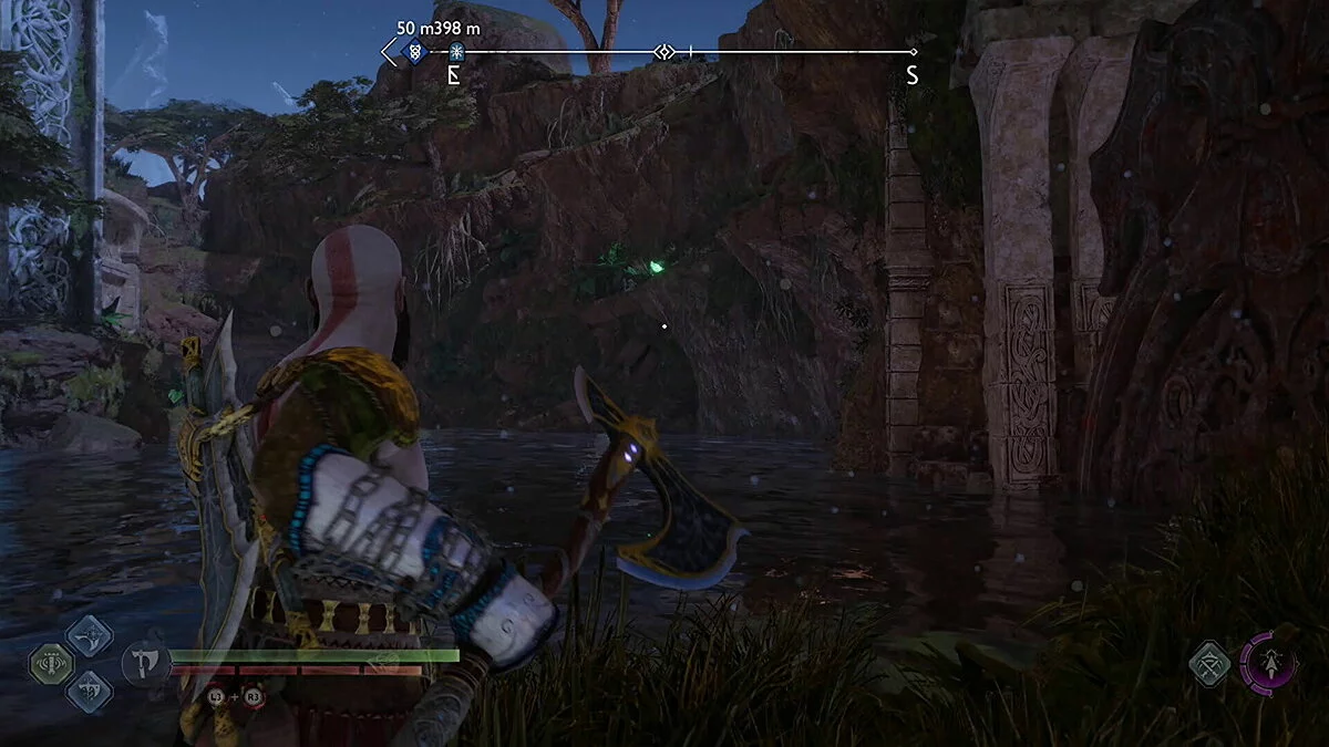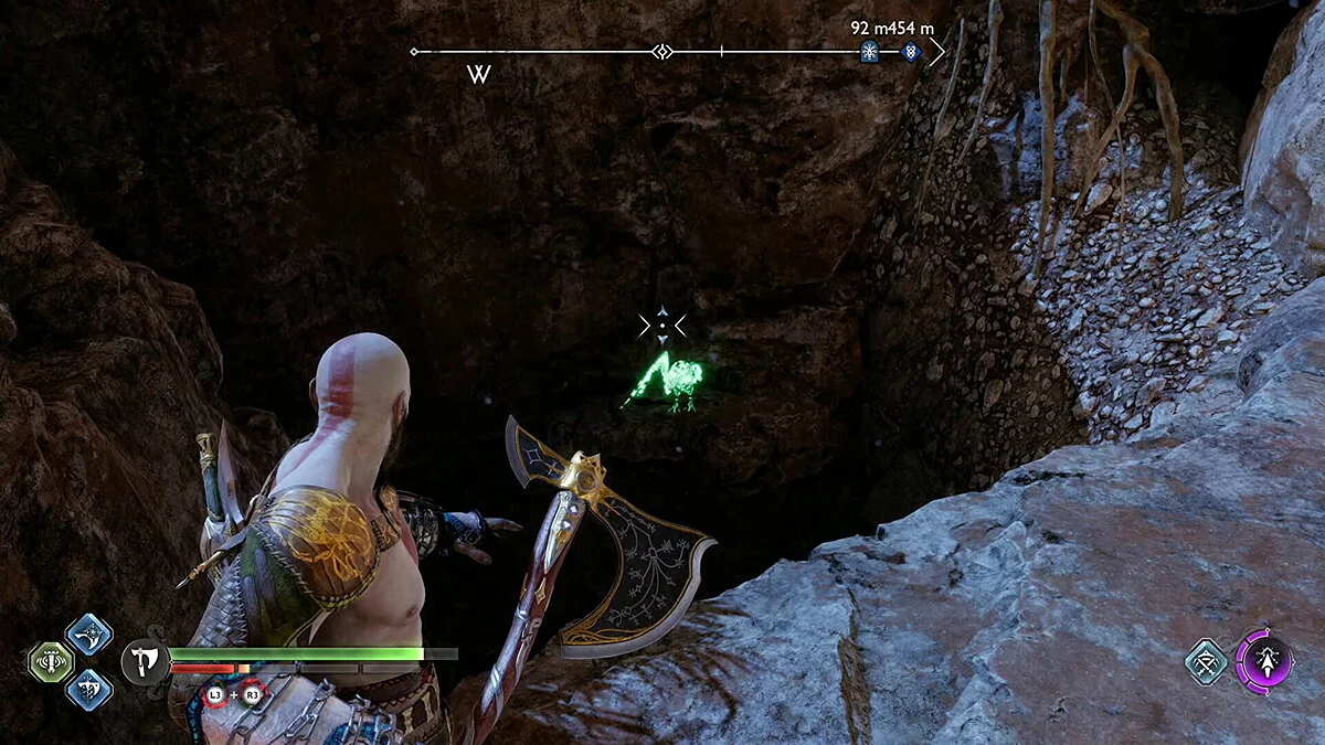 Цельтесь в нижнюю левую часть кристалла и встаньте Кратосом так, чтобы линия стала синей. Как только вы окажетесь на позиции, бросьте свой топор.