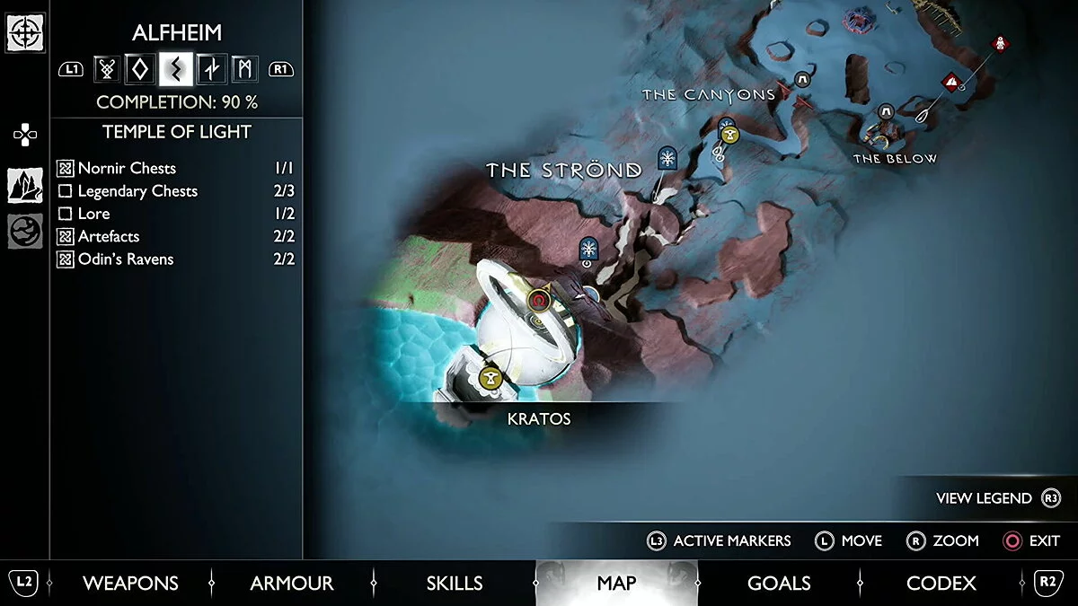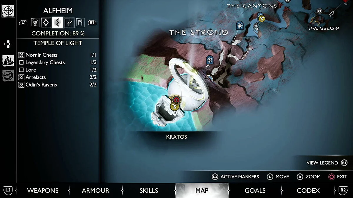 Следуйте через Храм Света, пока не доберетесь до Света Альвхейма. Когда вы сделаете это, поверните направо на большую винтовую лестницу. Пройдите по ней всего несколько шагов, а затем спрыгните с левой стороны. Вы окажетесь в небольшой области с Артефактом, легендарным сундуком и одним из воронов Одина.