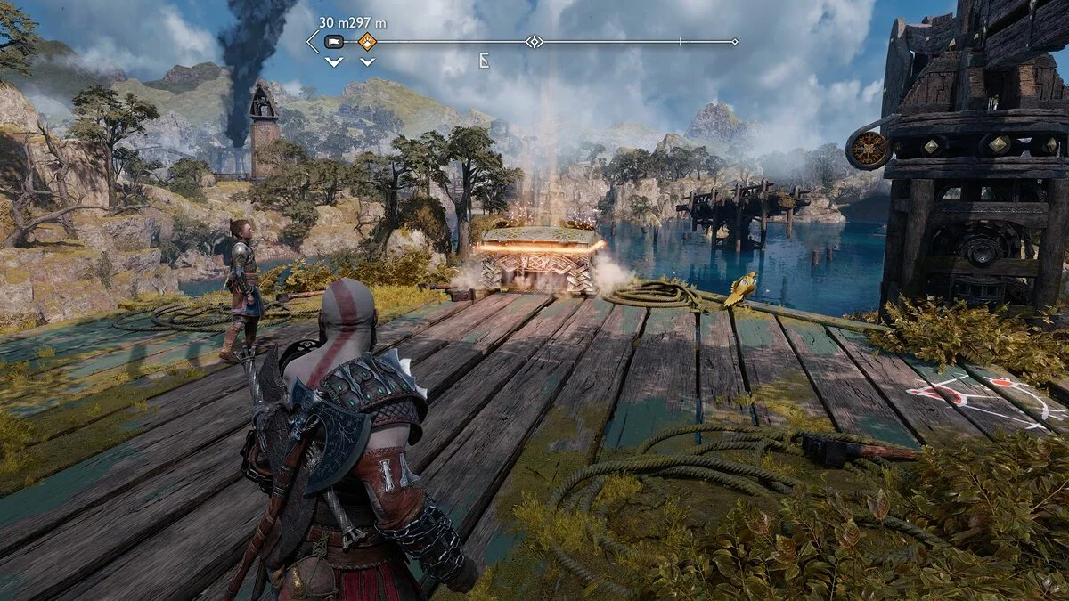 Когда вы доберетесь до пляжа, посмотрите направо, чтобы увидеть высокую платформу, где находится легендарный сундук. Вы можете добраться до него, уничтожив противников и забравшись наверх. Бросьте топор на вращающийся рычаг, чтобы открыть ворота на высокую деревянную платформу.