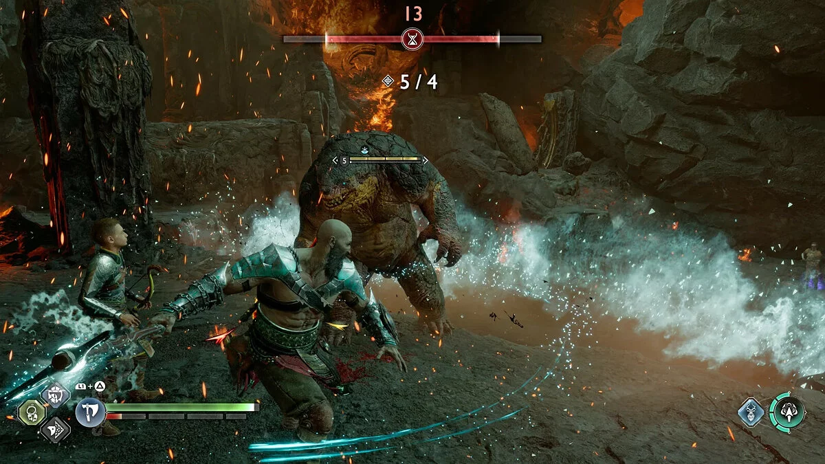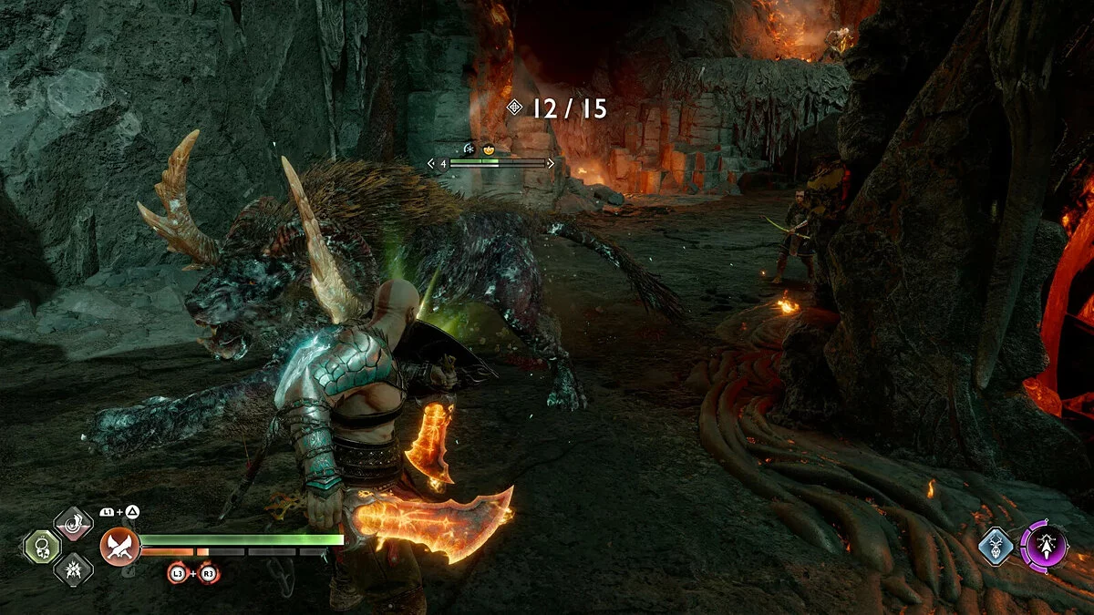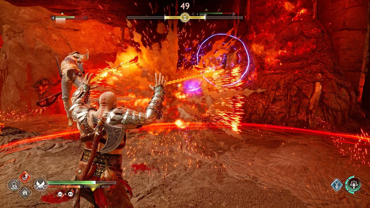 Используйте своего союзника, чтобы срывать любые атаки, пока вы убиваете обычных врагов. Используйте способность Кратоса «Спартанская доблесть», чтобы исцелиться в случае чрезвычайной ситуации.
