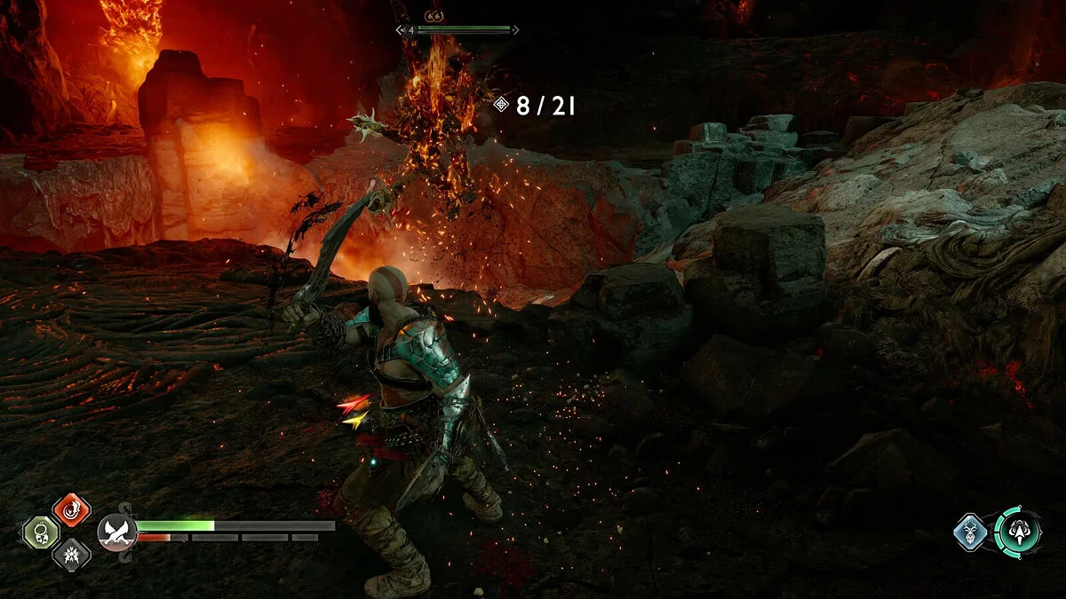 - Награда: Наплечник неугасимого пламени (при полном заряде вечной мерзлоты, жара или вихря Кратос получает щит, предотвращающий потерю заряда при первом пропущенном ударе), 100 опыта Кратоса, 100 опыта компаньона, 1000 рубленого серебра, 250 божественного пепла.