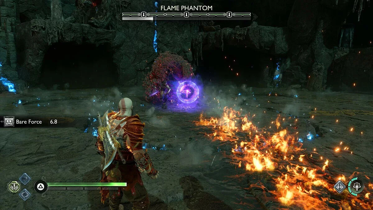 На этом этапе вы столкнётесь с огненным Фантомом — это шарообразное существо. Сосредоточьтесь на ударе по шару, чтобы увеличить его шкалу ошеломления, особенно когда он светится. Лучше всего использовать дальние атаки. Это позволит оглушить существо. Нанесите достаточно урона, и он отступит, что позволит вам переключить внимание на светящиеся фиолетовые колонны, которые являются истинными целями.