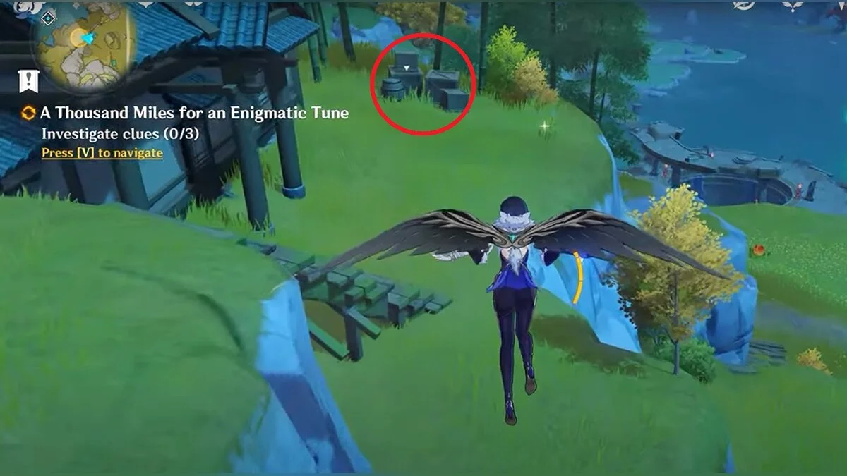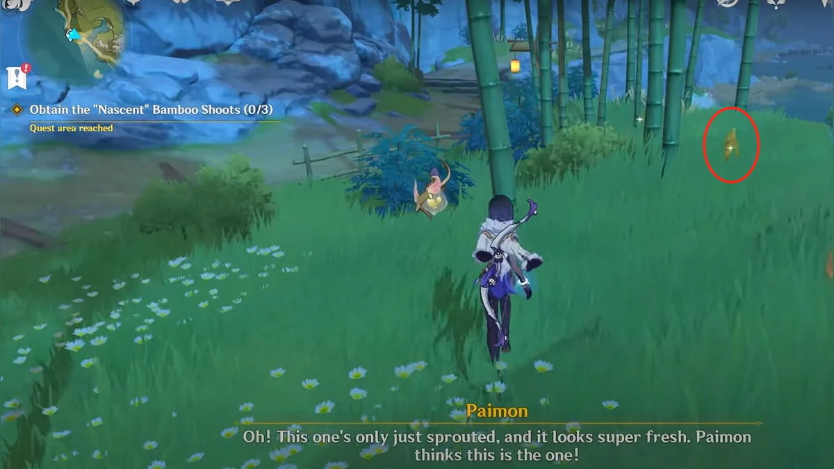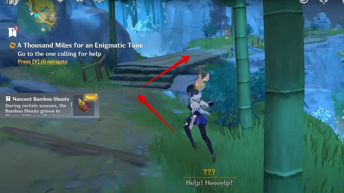 Посмотрите видеоролик, а затем телепортируйтесь на север локации. Нужная точка будет обозначена на вашей карте. Вам нужно будет собрать три молодых побега бамбука.