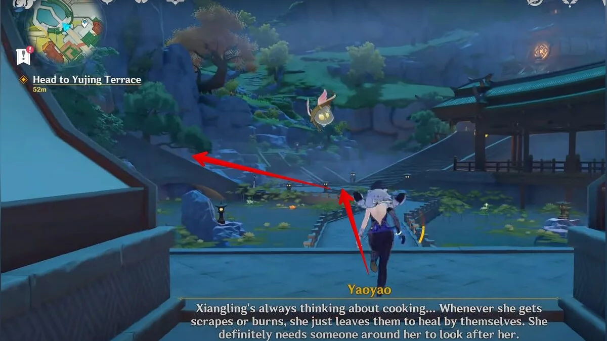 Нужно найти Гань Юй. Бегите на юг и поднимайтесь по ступенькам наверх. Девушка ждёт вас там.