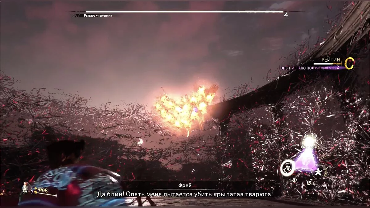 Чтобы успешно их уничтожить, используйте захват цели. К сожалению, игра плохо удерживает прицел, поэтому фиксатор нужно постоянно возвращать назад на крылья. Как только одно крыло загорится — рыцарь не сможет взлетать, однако его атаки станут опаснее. Воин ускоряется, оставляя за собой огненный след, придется увернуться несколько раз, чтобы не попасть под такой опасный рывок.