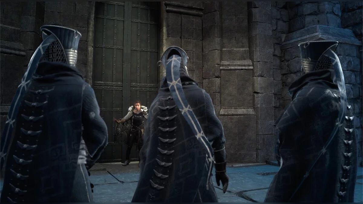 На подступах к замку большая петляющая лестница, которая постепенно поднимается в гору. Там есть враги с баллистами, поэтому придется уворачиваться от снарядов. Оказавшись за крепостной стеной, вы попадете в город перед замком. Тут можно выбрать путь — в открытую или по скрытному проходу слева по скале. Мы так и не поняли чем эти пути отличаются, так как выбрали стелс и все равно пришли к главным воротам. Возможно, вы заметите то, что не увидели мы. У ворот ждет много противников: рыцари-изменники, рыцари со щитами и других.