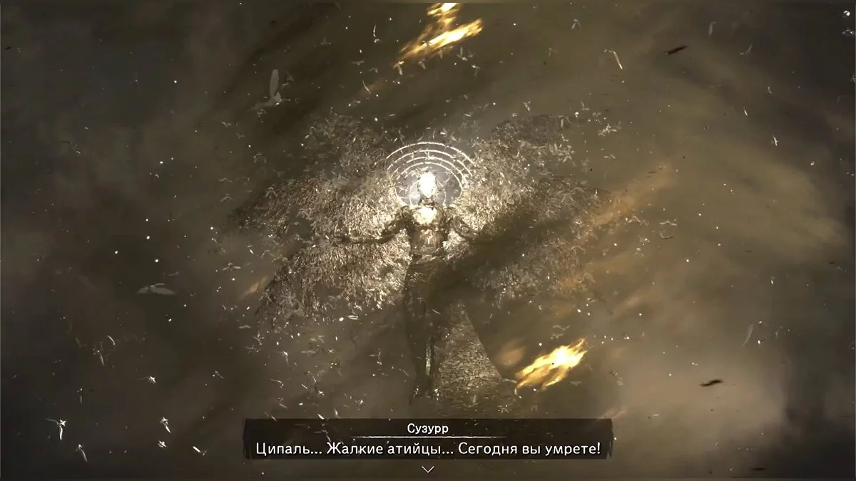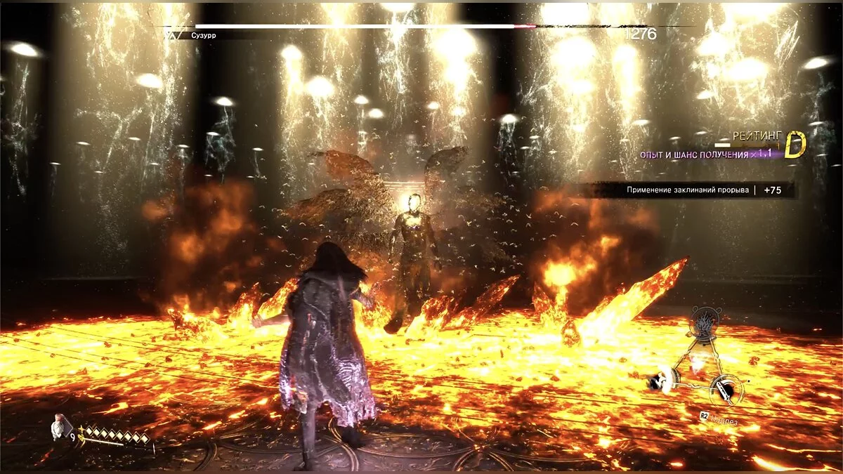 Когда отнимете ¼ жизней, Сузурр взлетит, а огонь перестанет помогать. В эти моменты будьте особенно внимательны — все его атаки по площади, увернуться очень сложно. Приемов несколько — золотая птица, множество огненных шаров или молнии на полу. Не забывайте использовать телепорт — он все еще работает. Лучше вообще не атаковать демона, пока он в воздухе и сосредоточиться на уклонении. Босс в итоге все равно приземлится, а вы сохраните много жизней.