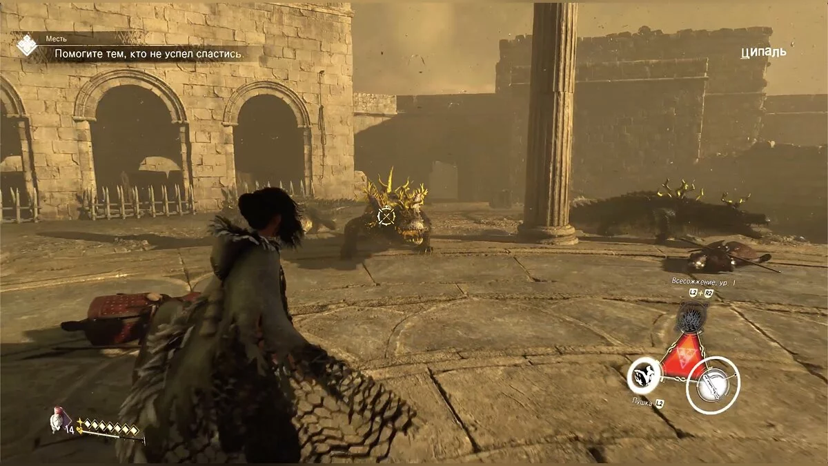 Вернувшись в Ципаль, Фрей решит сначала вывести людей. Вы попадете на площадь Нижнего города. Сначала разберитесь с бронированными крокодилами. Затем придется сразиться со стаями ворон (мы снова не шутим). В третьей волне будут волки и огненный великан. Проще всего убить их молниями или водой.