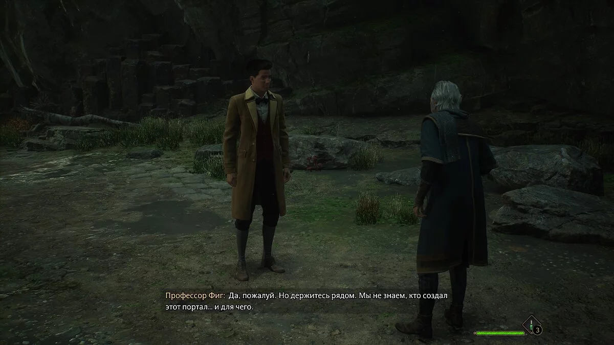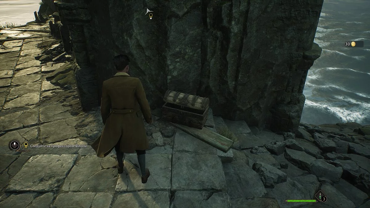 Следуем в зал картографии и общаемся с процессором Фигом и портретами. Отправляемся по маркеру к побережью Крэгкрофта. Используем Конфринго на стене и разговариваем с профессором. Следуем по маркеру дальше. По пути можем выполнить несколько испытаний Мерлина.