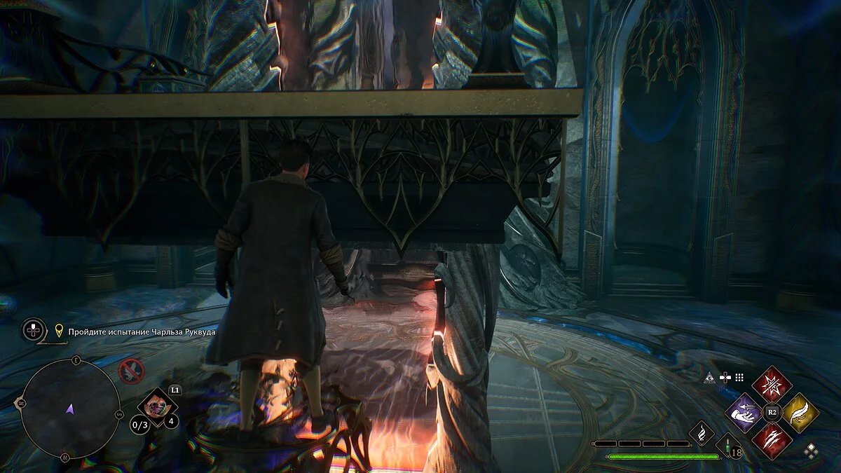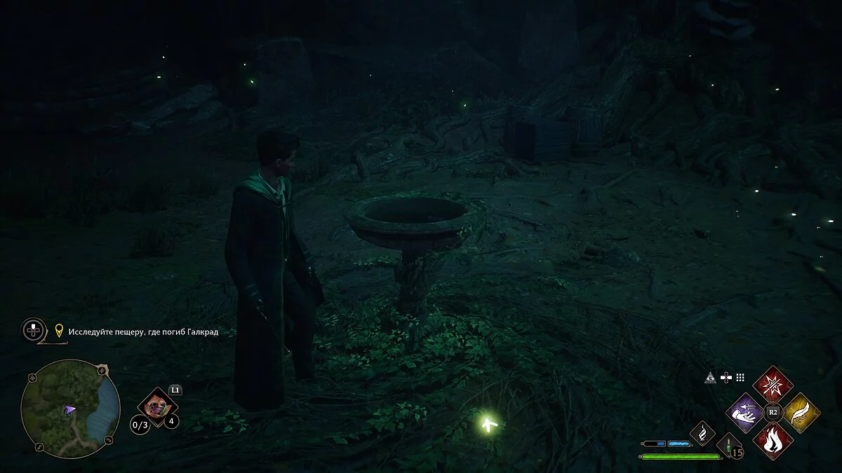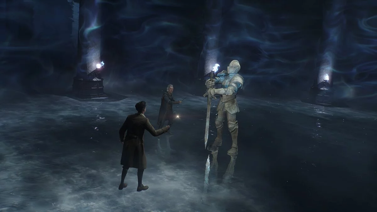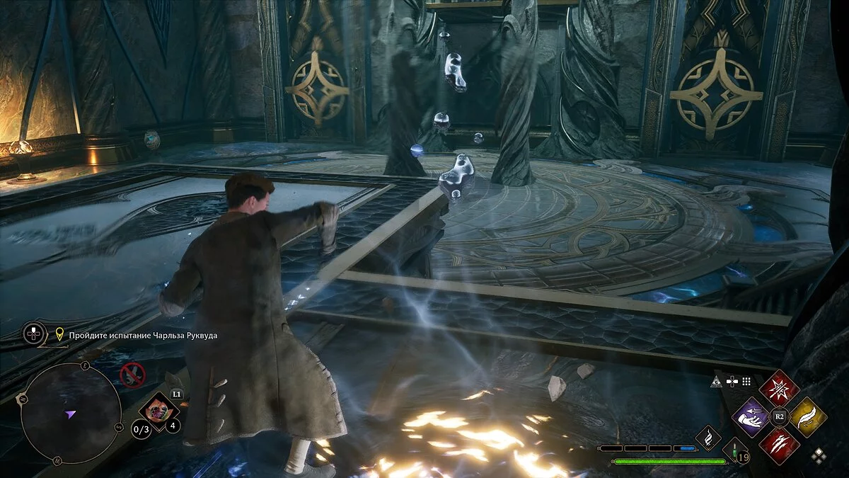 Двигаемся вместе с профессором и находим голубое свечение. Используем Ревелио на рыцаре и активируем Люмос. Вовремя используем протего и сражаемся с каменными рыцарями. Три раза отражаем атаки и используем атакующее заклинание, чтобы добить оставшихся врагов. По огонькам добираемся до ещё одной точки свечения.