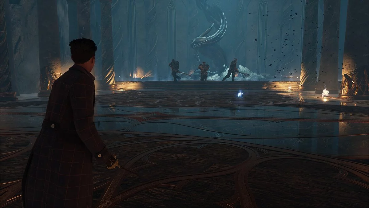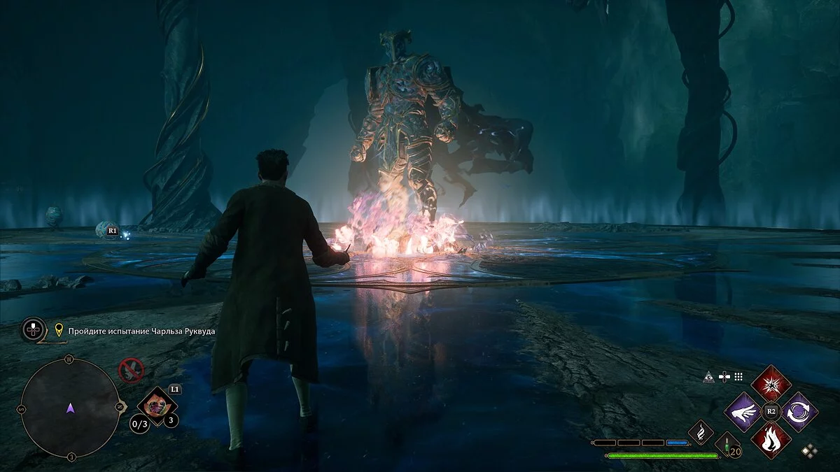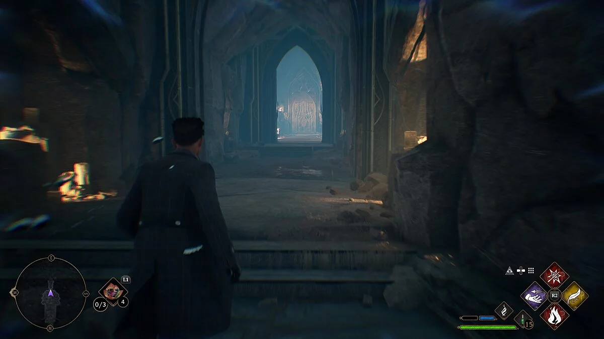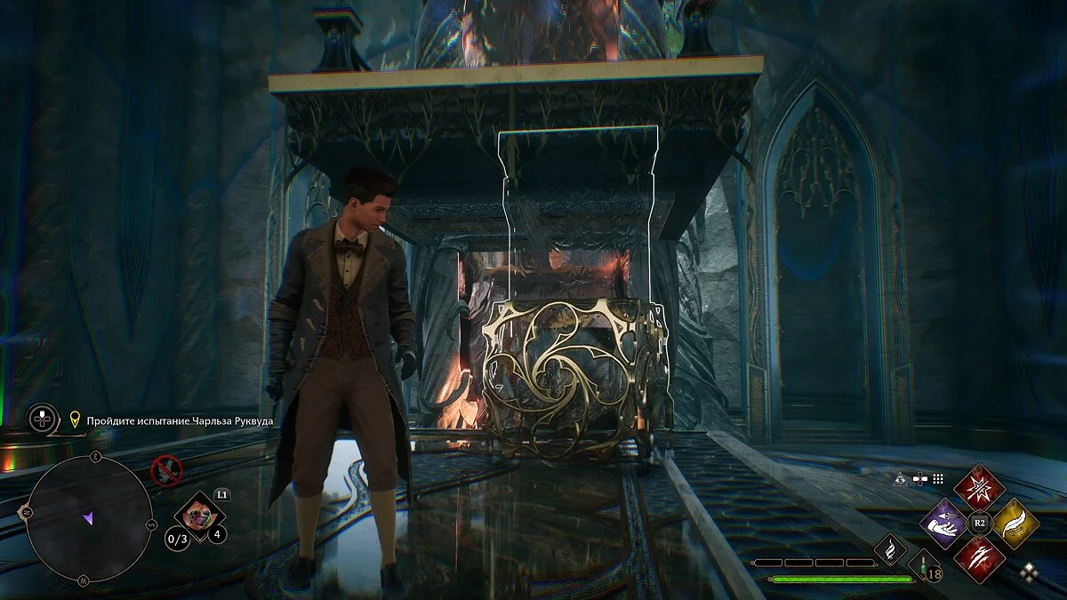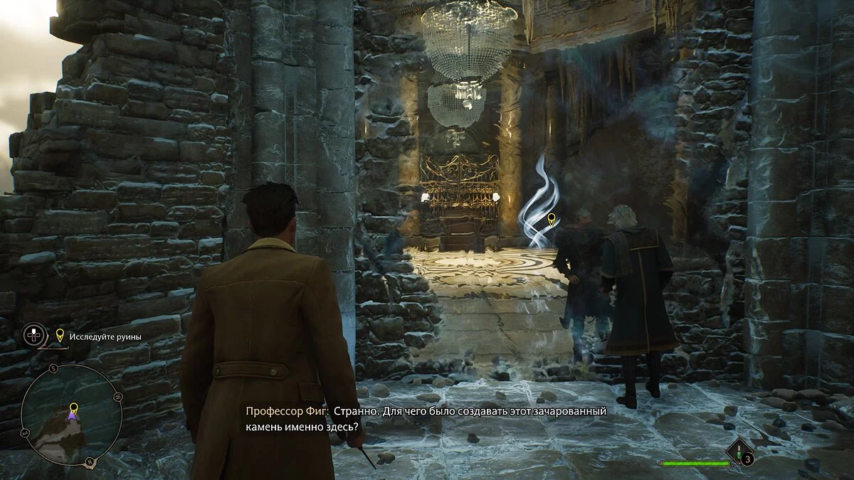 Двигаемся вместе с профессором и находим голубое свечение. Используем Ревелио на рыцаре и активируем Люмос. Вовремя используем протего и сражаемся с каменными рыцарями. Три раза отражаем атаки и используем атакующее заклинание, чтобы добить оставшихся врагов. По огонькам добираемся до ещё одной точки свечения.