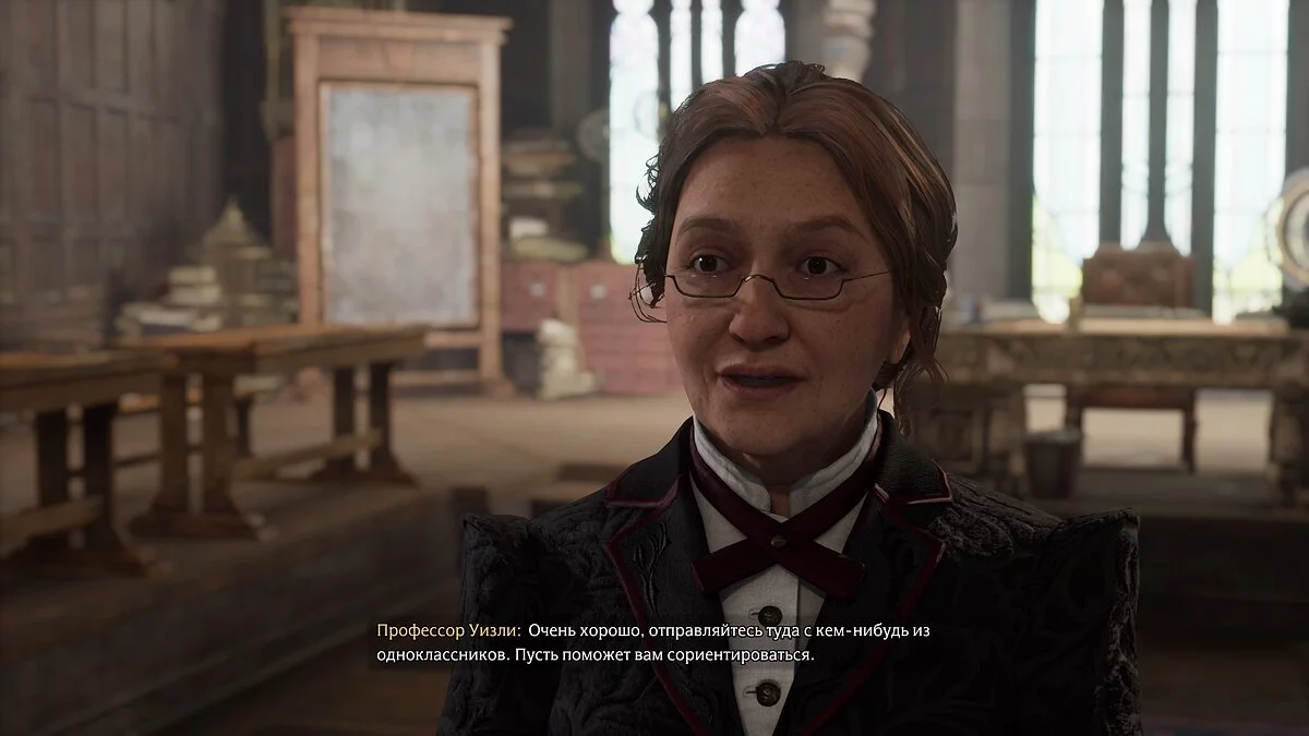 Следуем по маркеру и общаемся с профессором. Задаём Уизли все вопросы для завершения сюжетной миссии. Выбираем одного из учеников с кем главный герой пойдёт к Хогсмид. На сюжет это значительно не повлияет.