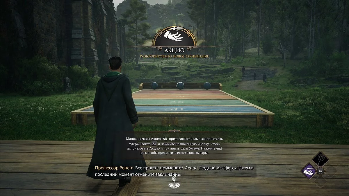 Применяем Акцио на шарах. Чтобы остановить их в синей зоне, необходимо отпустить акцио в оранжевой зоне. Во втором раунде учитываем передвигающиеся ящики и двигаем шары на себя. Общаемся с Натсай Онай. После окончания урока разговариваем с профессором Роненом. На выходе из класса можем пообщаться с Самантой Дейл.
