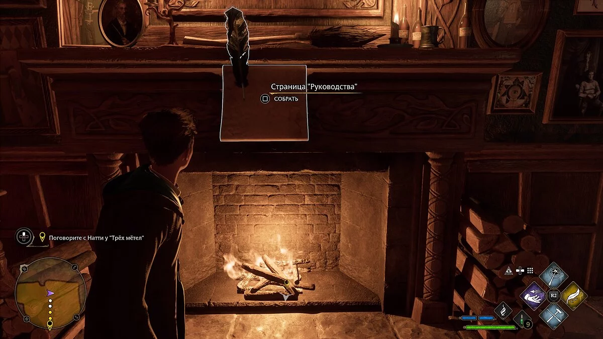 Изучаем камин при помощи Ревелио и получаем страницу «Руководства» — «Три метлы». Поднимаемся по лестнице и находим шестиугольные очки в золотой оправе. Выходим на улицу, разговариваем с другом и возвращаемся в свою гостиную.