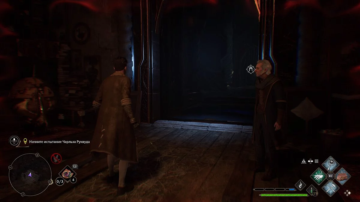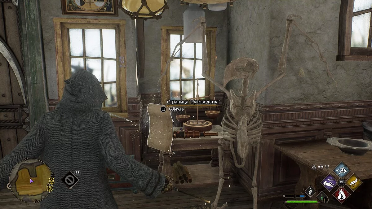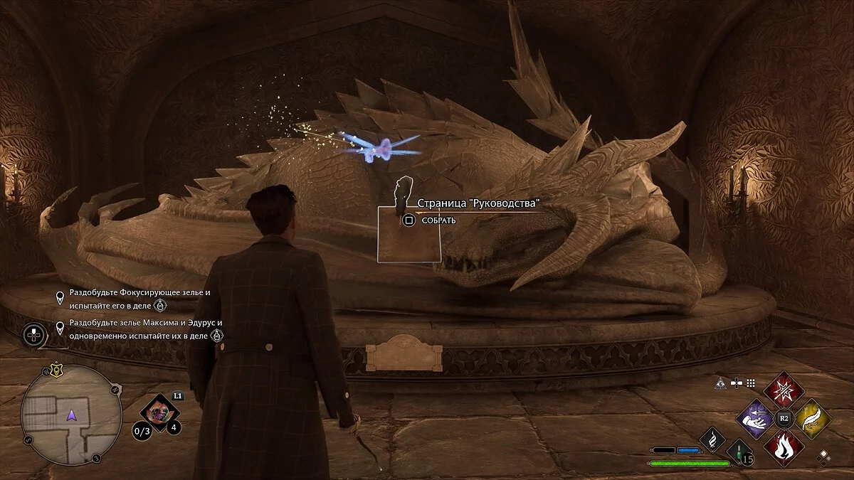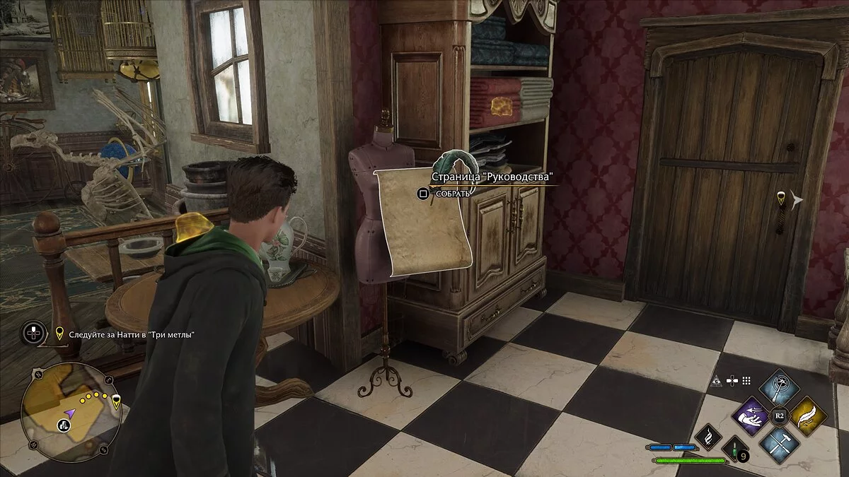 Эту миссию нельзя пропустить по сюжету. Следуем по маркеру к профессору Гекат. По пути в кабинет возле скелета носорога замечаем летающий ключ. Поднимаемся наверх и взламываем ящик, чтобы получить жетон факультета. Нужно шлёпнуть по ключу, когда он пролетит над скважиной. В кабинете процессора Гекат используем Ревелио у лестницы и находим страницу «Руководства» — «Скелет гебридского чёрного дракона». Общаемся с учителем. Для обучения заклинанию Инсендио необходимо выполнить три дополнительные задачи — «Скрещённые палочки: Раунд 1», «Скрещённые палочки: Раунд 2» и «Тренировка комбинаций 1».
