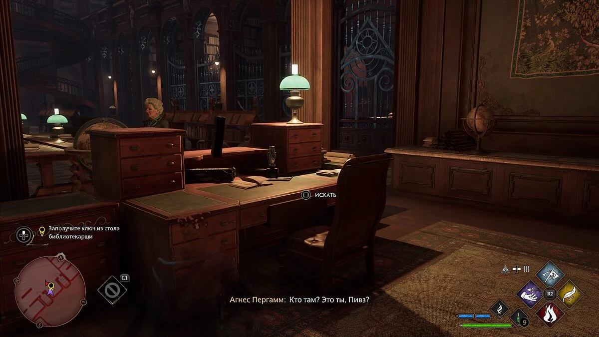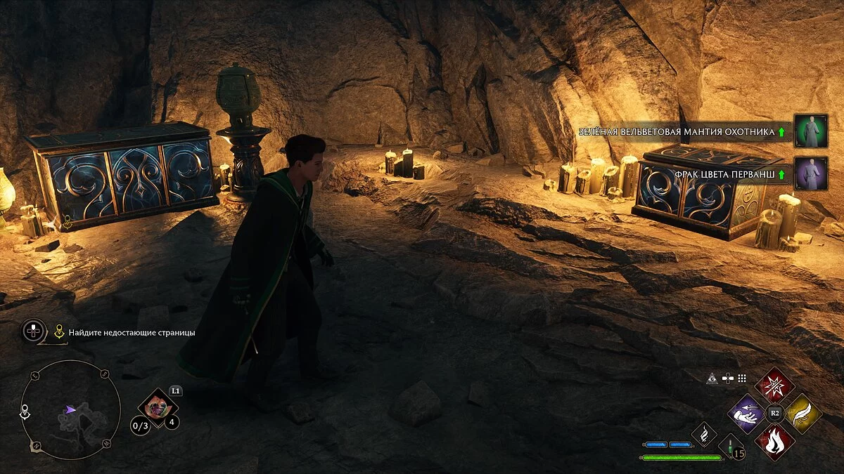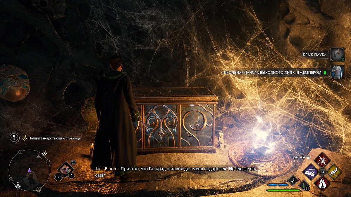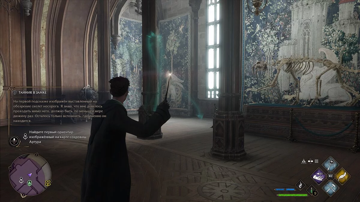 Используем Репаро и достаём из сундука золотые очки с глазами дракона. Спускаемся на один уровень ниже и возле арки находим в ящике дуэльные перчатки тёмных искусств. Исследуем древнюю магию и проходим через портал. Перед воротами находим накидку для квиддича, затем идём в читальню.