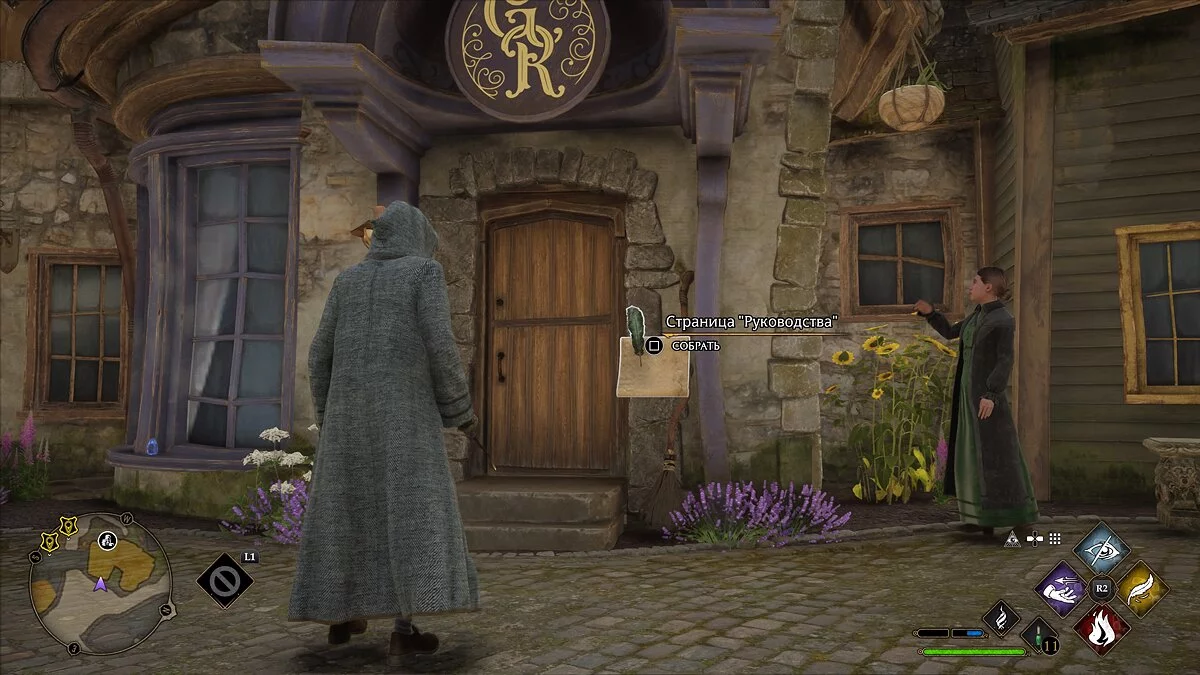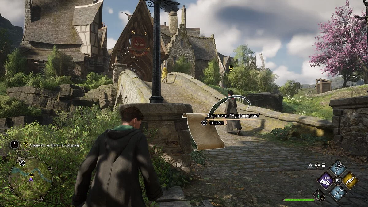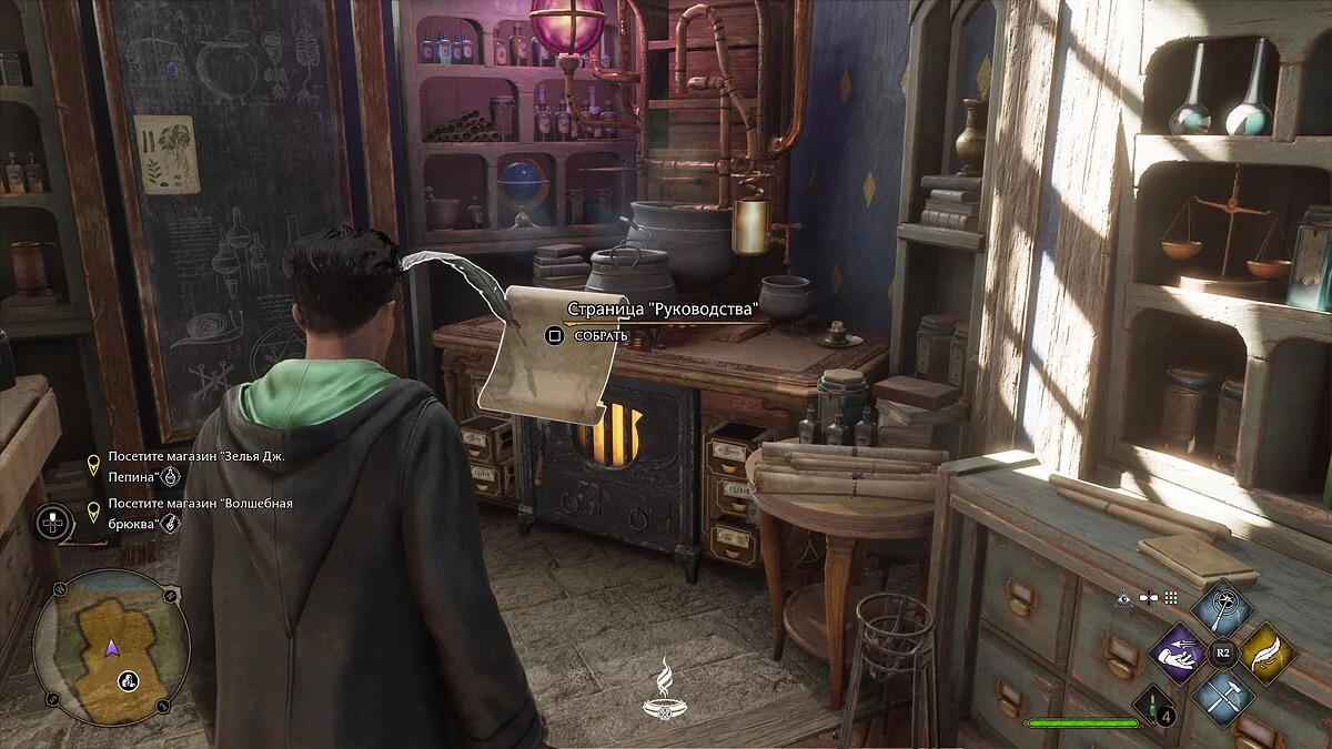 У входа в деревню активируем Ревелио и находим страницу «Руководства» — «Хогсмид». Проходим немного вперёд и в воздухе ловим ещё одну страницу «Руководства». Игроку необходимо посетить четыре магазина: