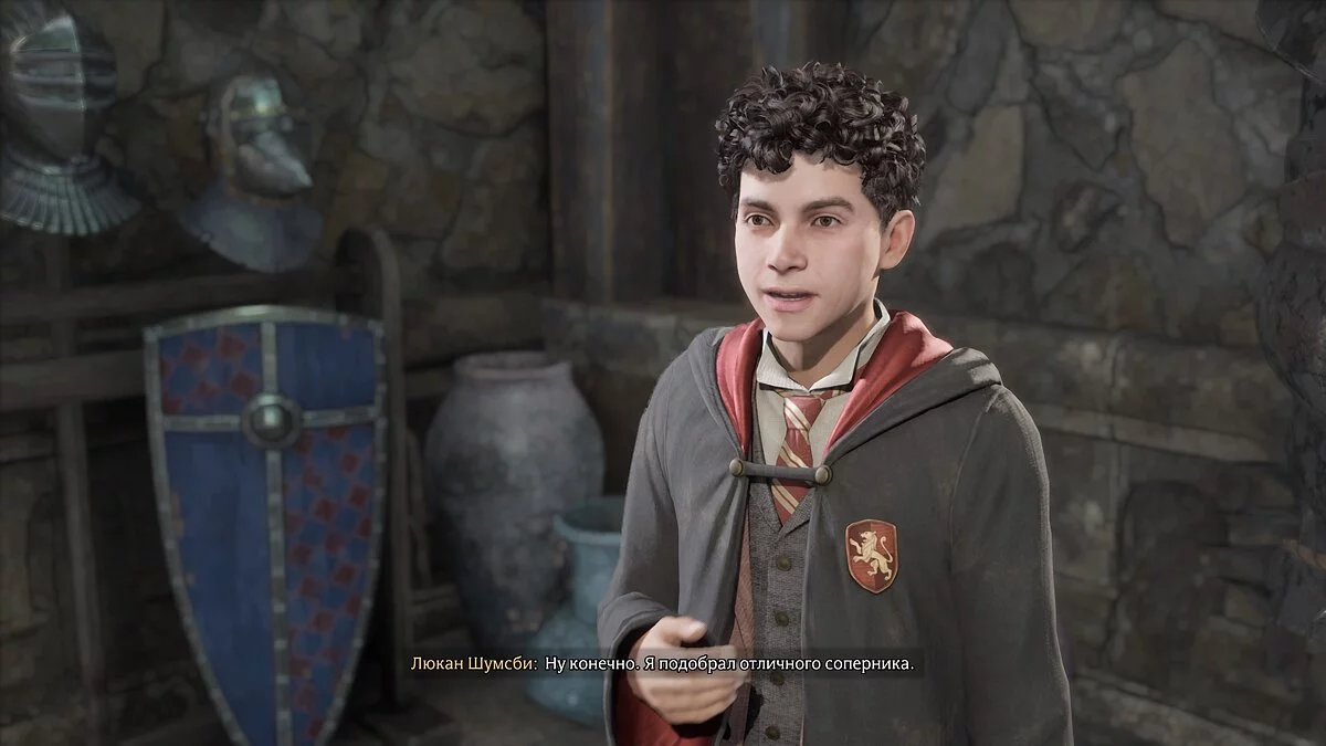 Общаемся с мальчиком и участвуем в дуэли. На жёлтый щит используем Левиосо, а на фиолетовый — Акцио.