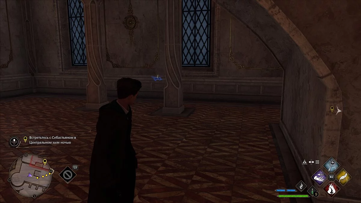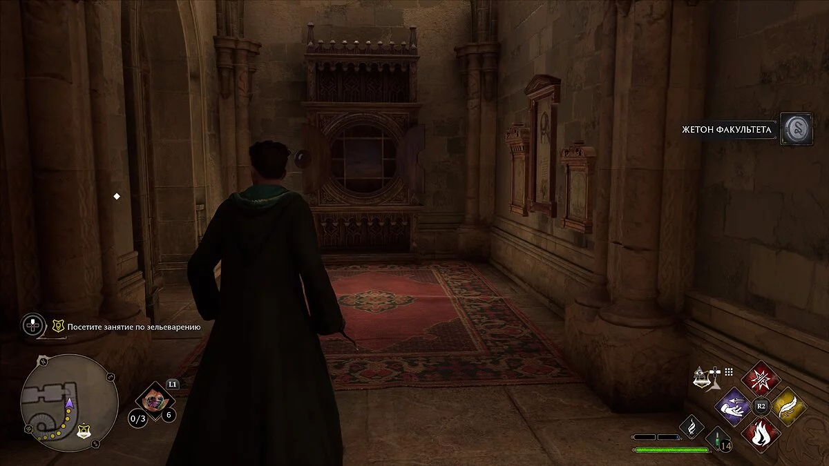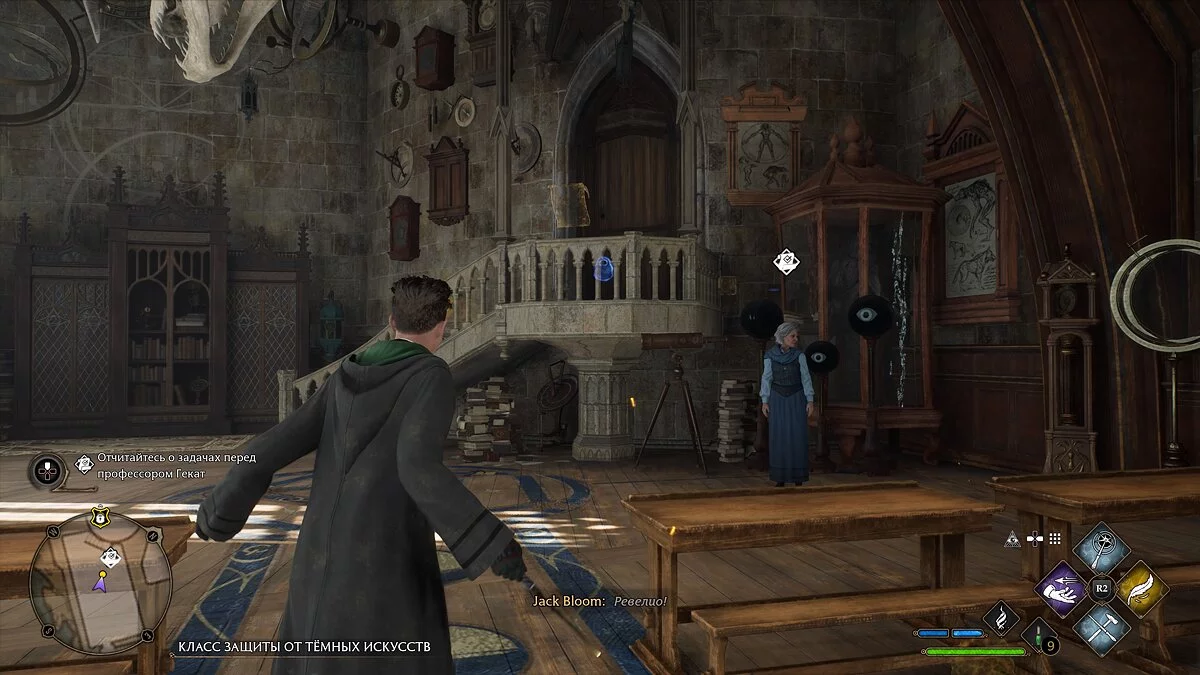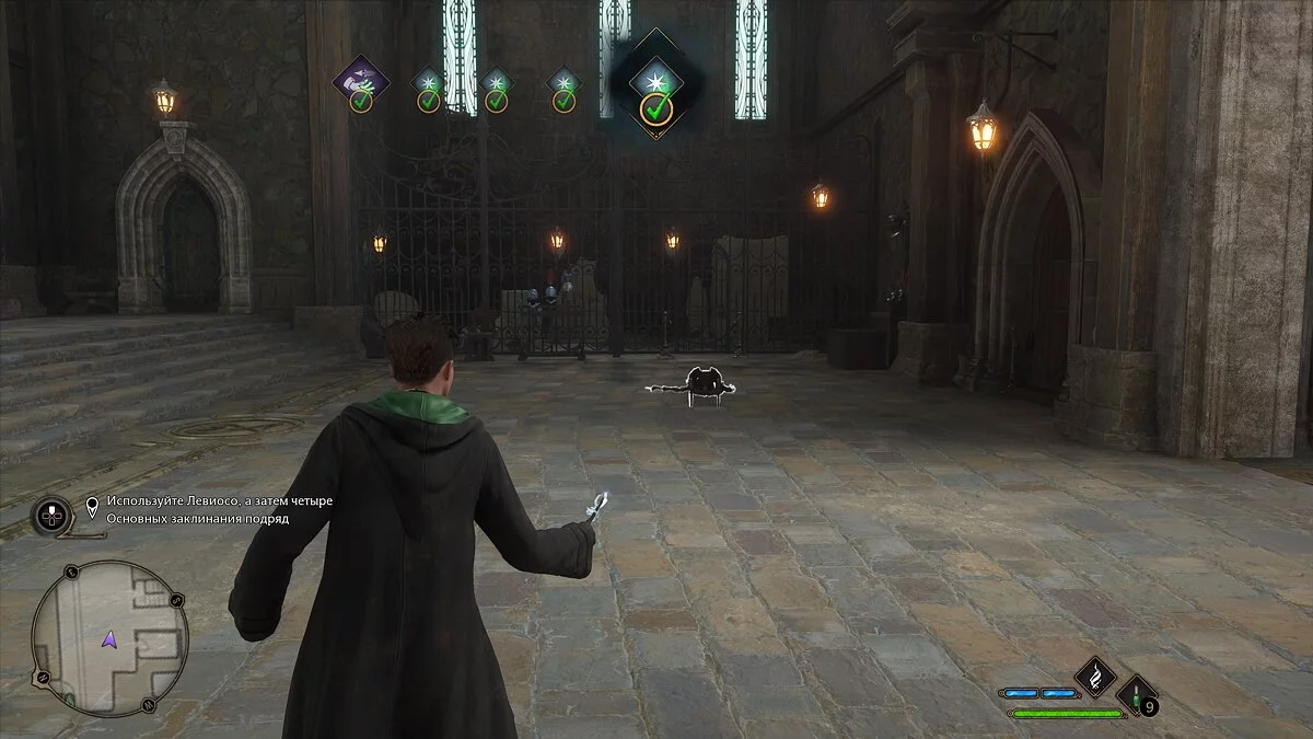 Активируем маркер и добираемся до класса. Изучаем Левиосо. Применяем заклинание и добиваем манекен. Побеждаем Себастьяна и после окончания урока общаемся с учеником, чтобы получить второстепенное задание.