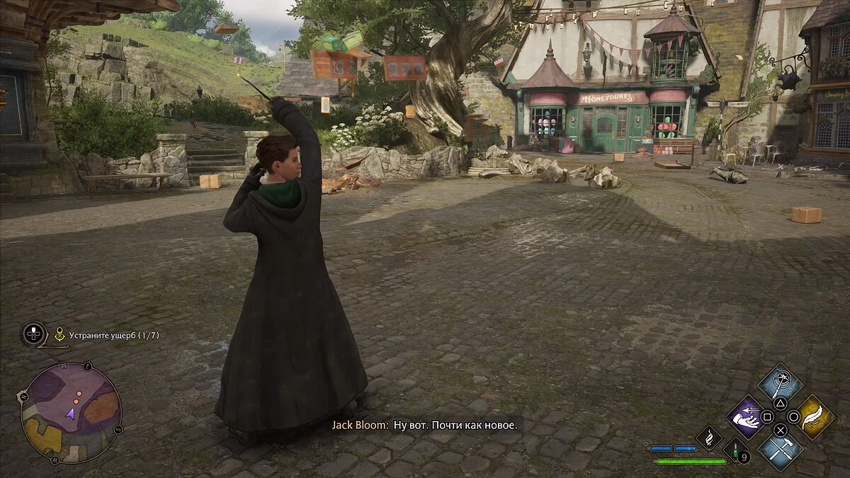 После схватки восстанавливаем площадь при помощи Репаро. Проходим внутрь магазина и общаемся с Августом Хиллом. Получаем традиционную школьную мантию.