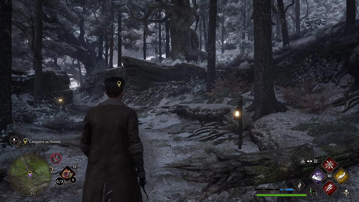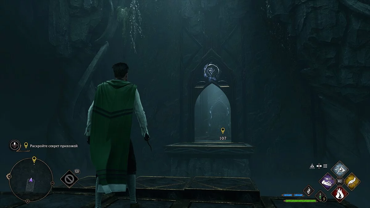 Находим таинственную мантию и надеваем её. Следуем по маркеру и переходим к следующей локации.