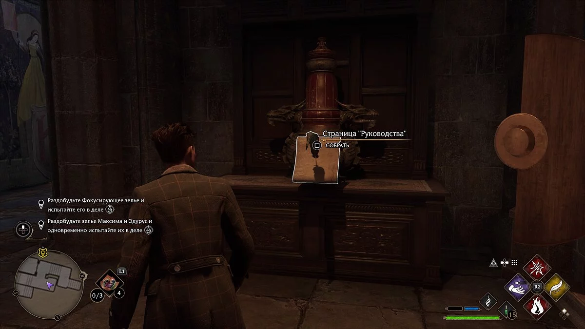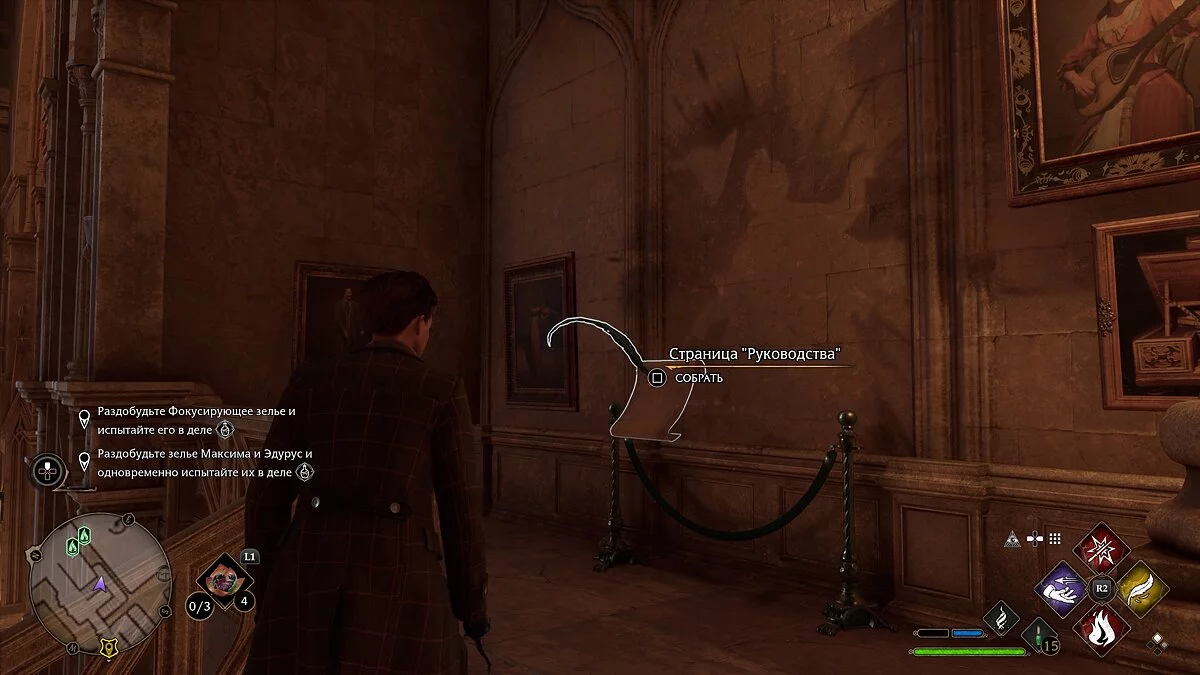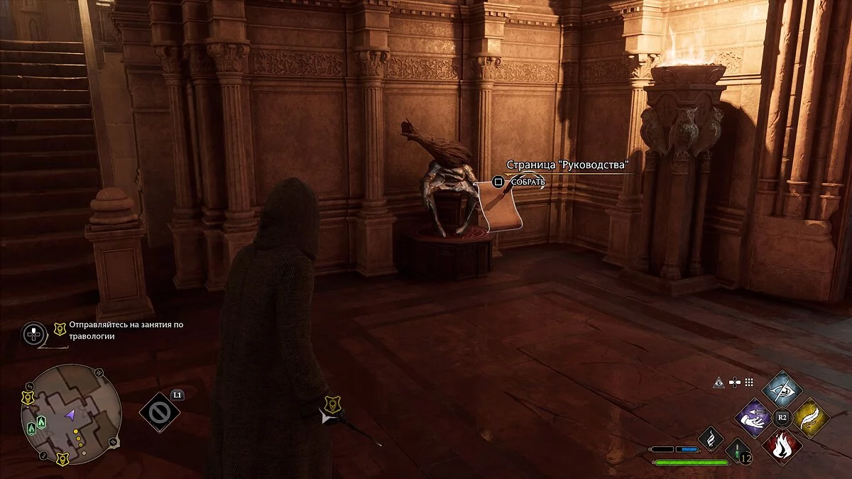 Это побочное задание появляется после завершения первого урока по Защите от тёмных искусств. Обязательно к прохождению по сюжету. По маркеру добираемся до Люкана Шумсби. Перед дверью активируем Левиосо на статуе, чтобы получить страницу «Руководства».