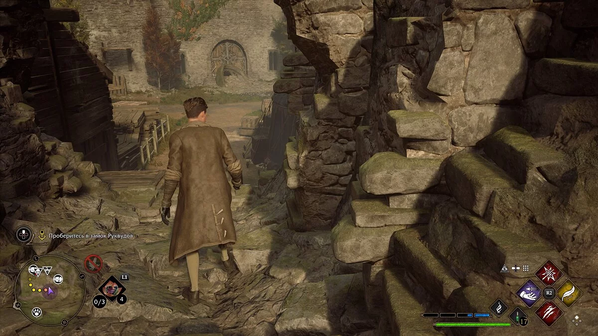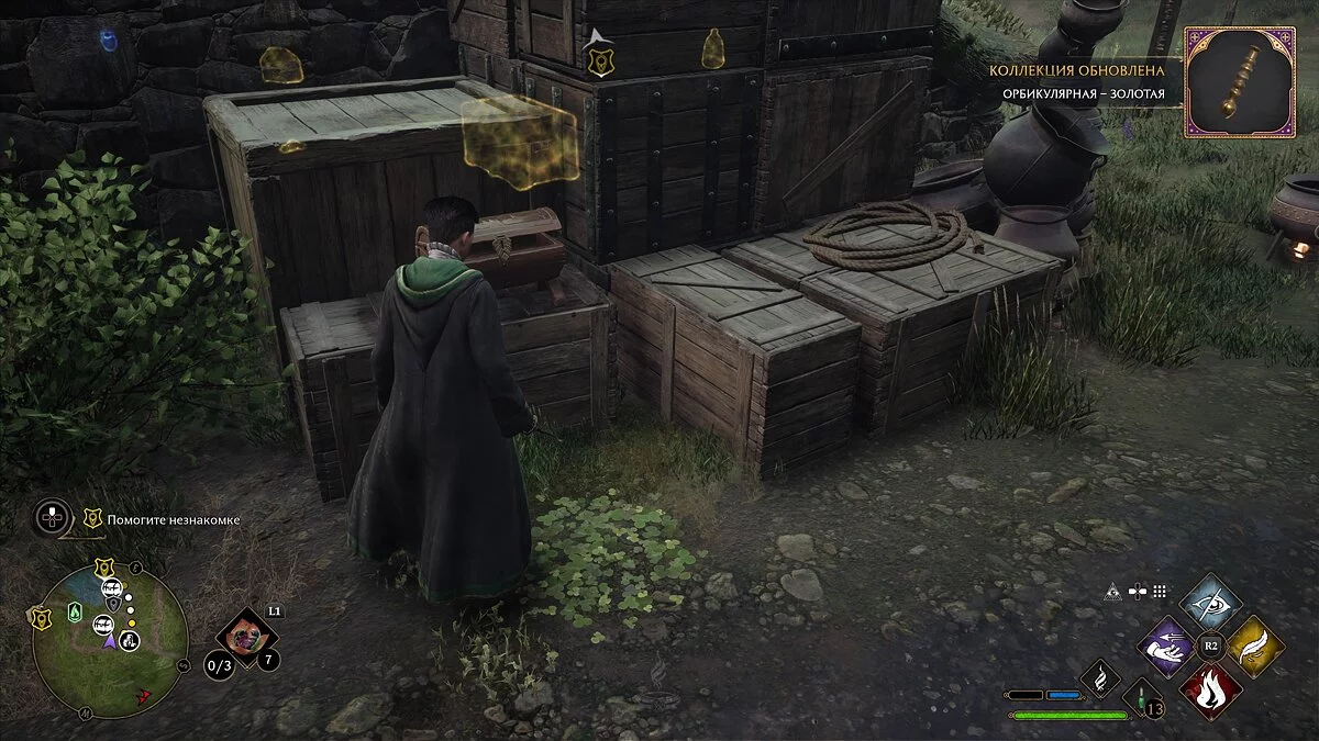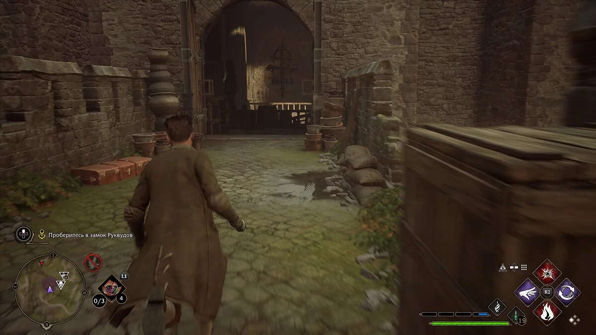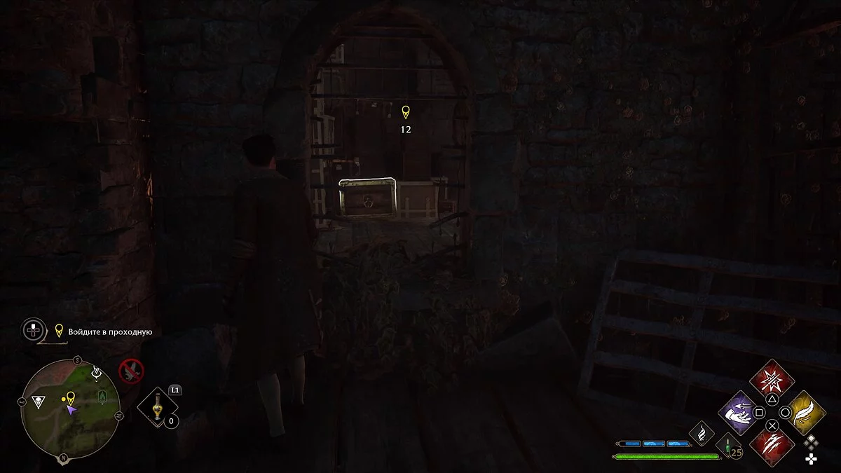 Отправляемся в замок Фалбартон. Общаемся с Натсай и проходим в строение. При помощи Депульсо попадаем в механизм и вытаскиваем ящик. Передвигаем предмет к стене, используем Левиосо и забираемся выше. Обходим стену с правой стороны и отодвигаем ящик. Пролезаем внутрь, активируем Депульсо и Акцио, чтобы открыть ворота подруге. Проходим вперёд.