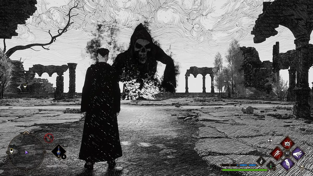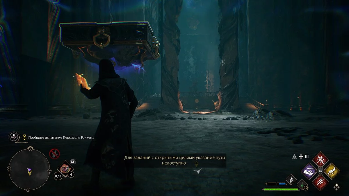 Слева от запертой двери забираем бабочку и подносим к ней. Перетаскиваем две бабочки к следующим воротам, используем Депульсо на полуразрушенной стене и относим третью бабочку. Проходим вперёд и уничтожаем инферналов. Двигаемся в следующее помещение. Хватаем бабочку и устанавливаем в устройство по центру. Применяем Депульсо для поднятие платформы справа. Забираемся наверх, хватаем бабочку и вставляем в ворота. Относим ещё две бабочки и продолжаем путь дальше. При желании можем залезть направо и дойти до помещения с сундуком. Достаём скелетов из гробниц и создаём мост. Проходим вперёд и получаем новый предмет одежды.