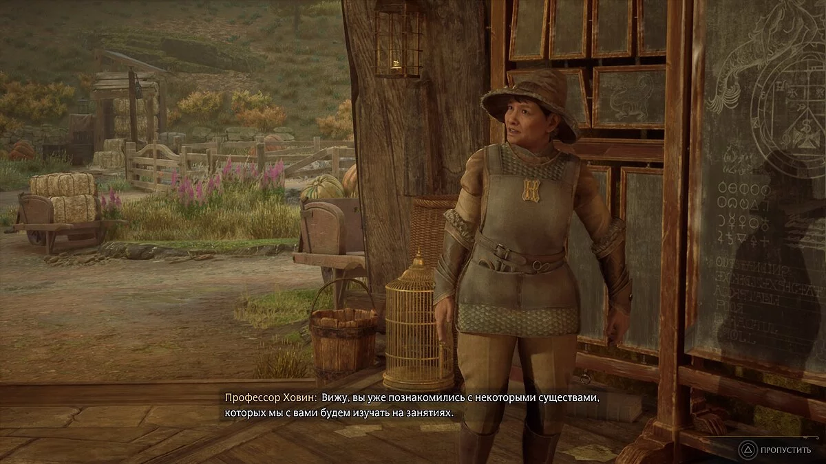 Идём на урок по изучению магических существ. Знакомимся с профессором Ховин. Используем щётку и корм на животных, похожих на котов. Разговариваем с профессором и общаемся с Поппи. Бежим за девушкой и встречаемся с гиппогрифом. Снова применяем щётку и корм.