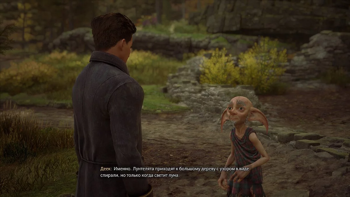 Общаемся с Лодгоком. Выходим из Хогсмида и следуем за гоблином. Добираемся до гробницы ведьмы. Проходим в подземелье.