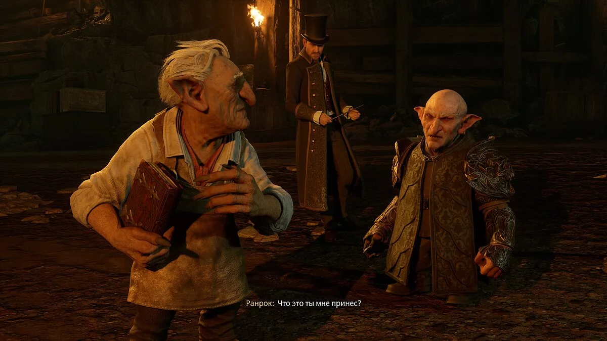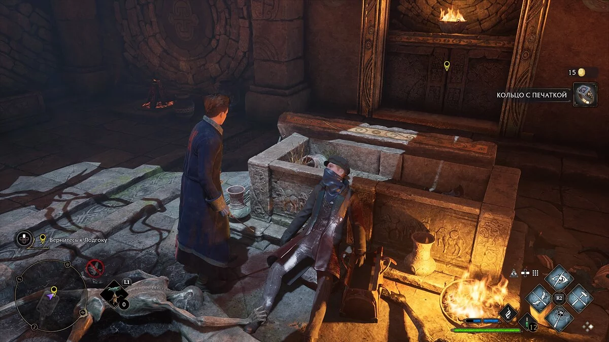 Осматриваем тело и находим кольцо с печаткой. Активируем платформу сзади гробницы и выходим наружу. Разговариваем с гоблином и идём по маркеру в лагерь бандитов.