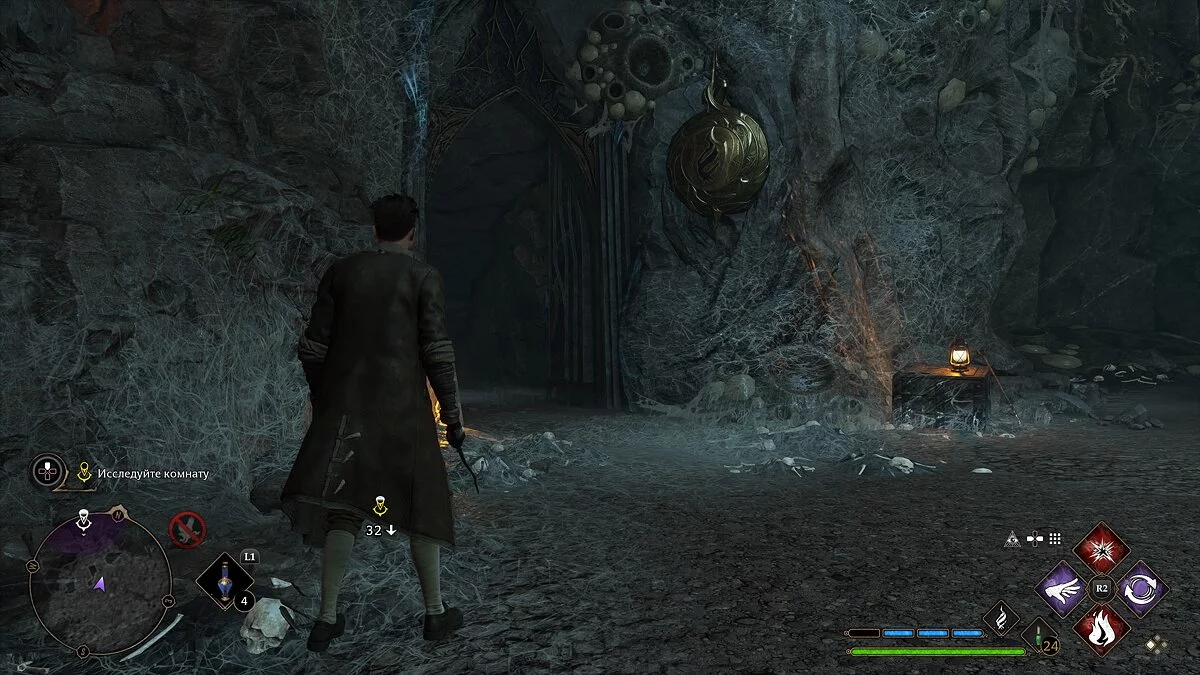 Используем Депульсо на камнях слева и спускаемся в подвал.