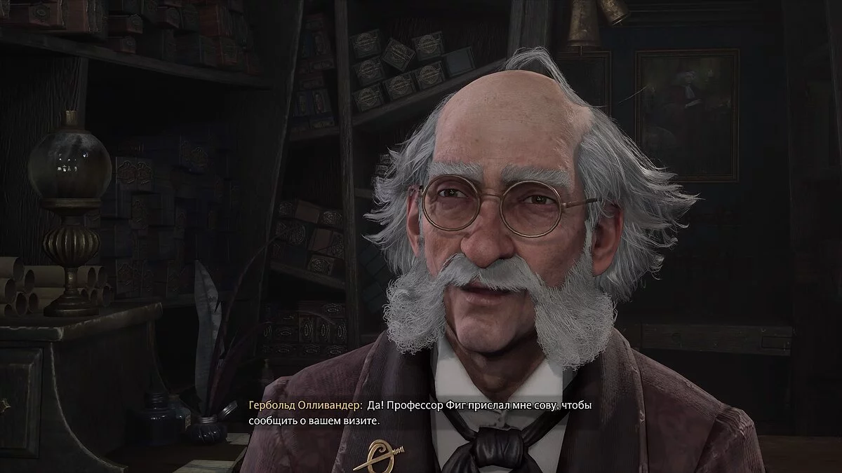 Перемещаемся в Хогсмит и общаемся с Гербольдом Олливандером. Ожидаем мужчину и получаем мощную волшебную палочку.