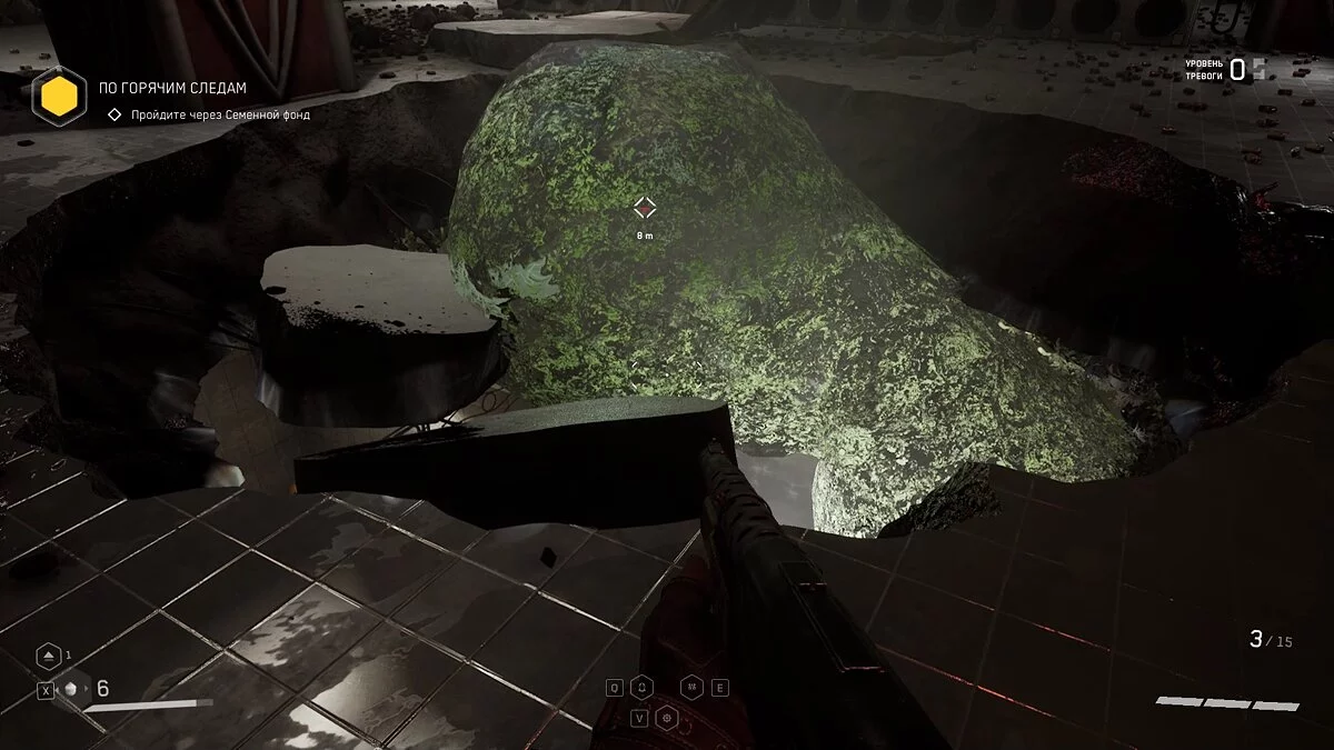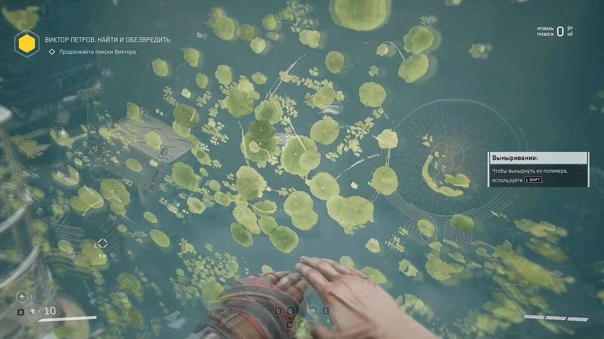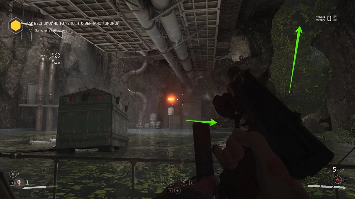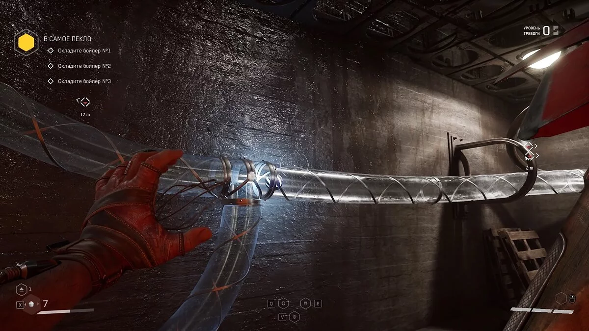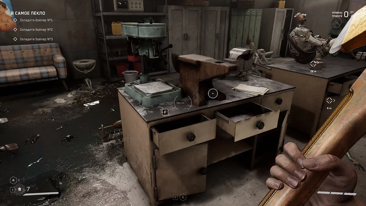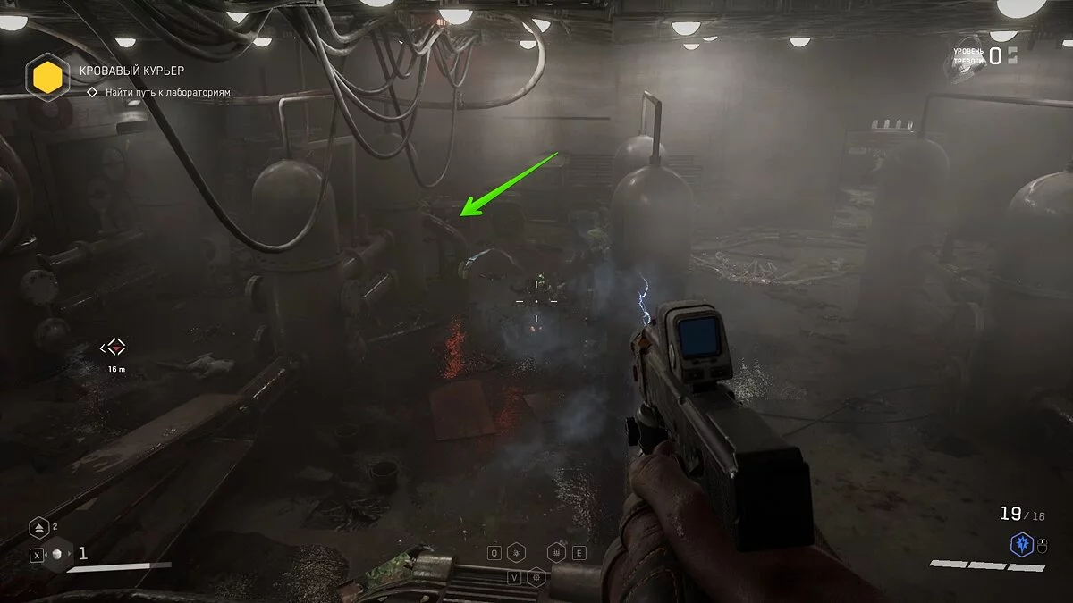 Следуйте по маркеру и убивайте мясных врагов. В бойлерной взаимодействуйте с задвижкой, чтобы заполнить соседнее помещение водой. Спуститесь вниз и проплывите к выходу.